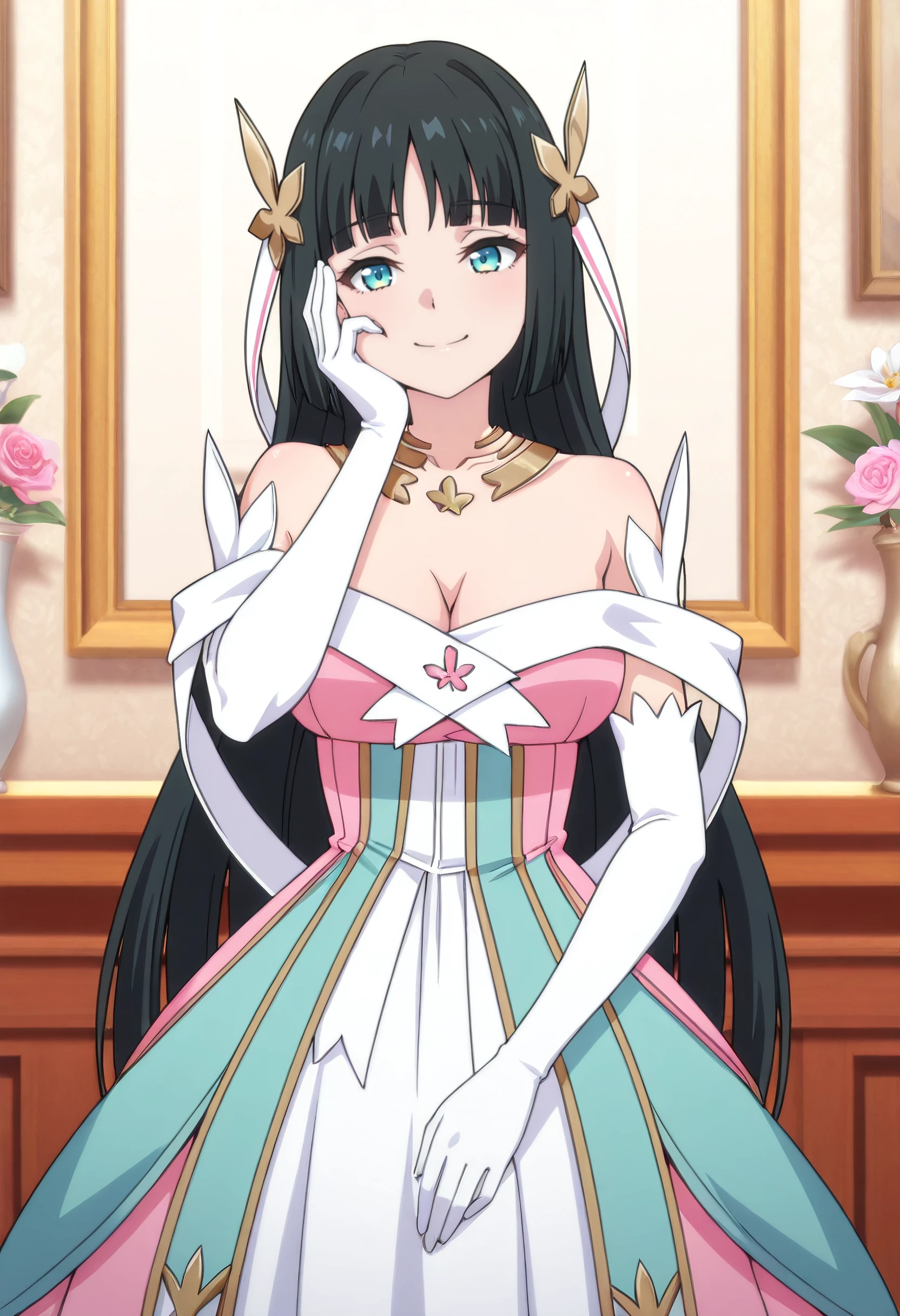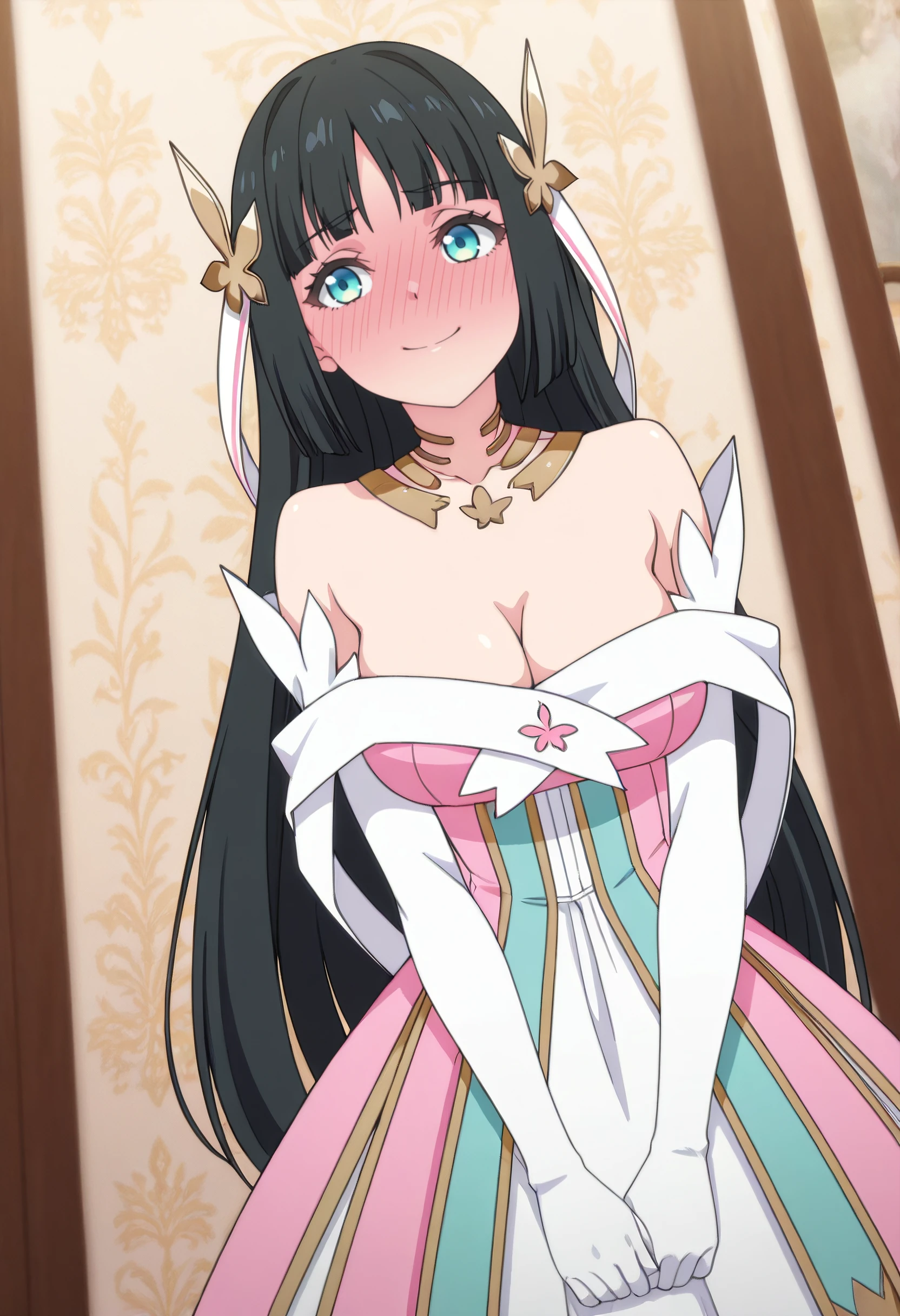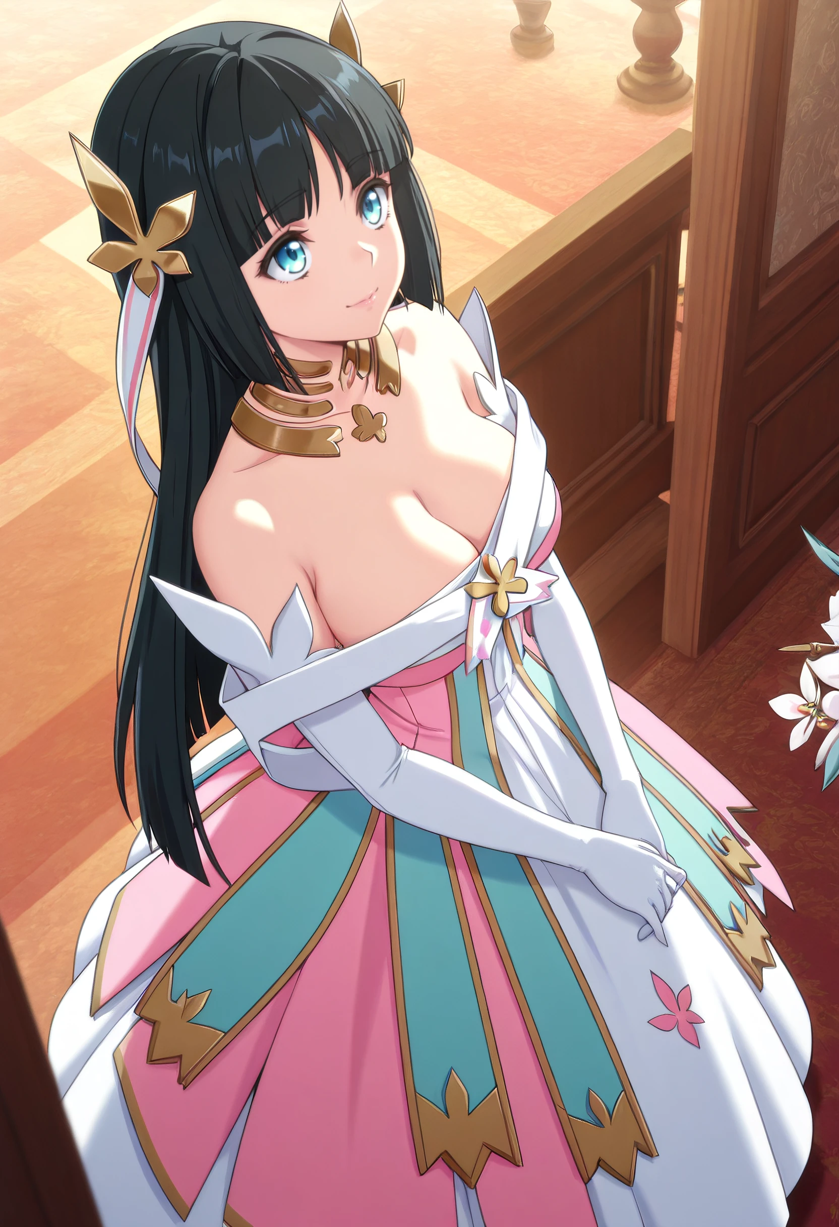 MilenaDress, dress, cleavage, bare shoulders, elbow gloves, gloves, white gloves, ribbon, hair ribbon, strapless dress, white dress, white ribbon, long dress, off-shoulder dress, pink dress, detached collar, strapless,