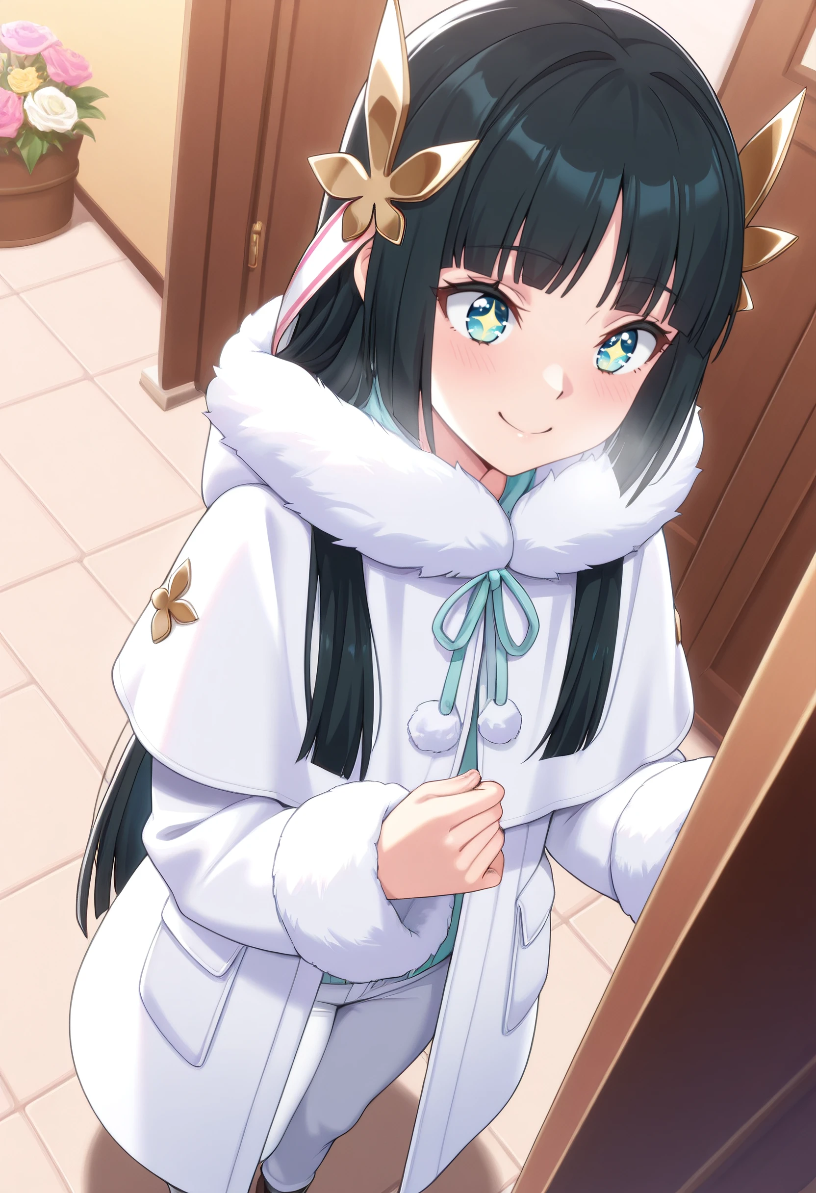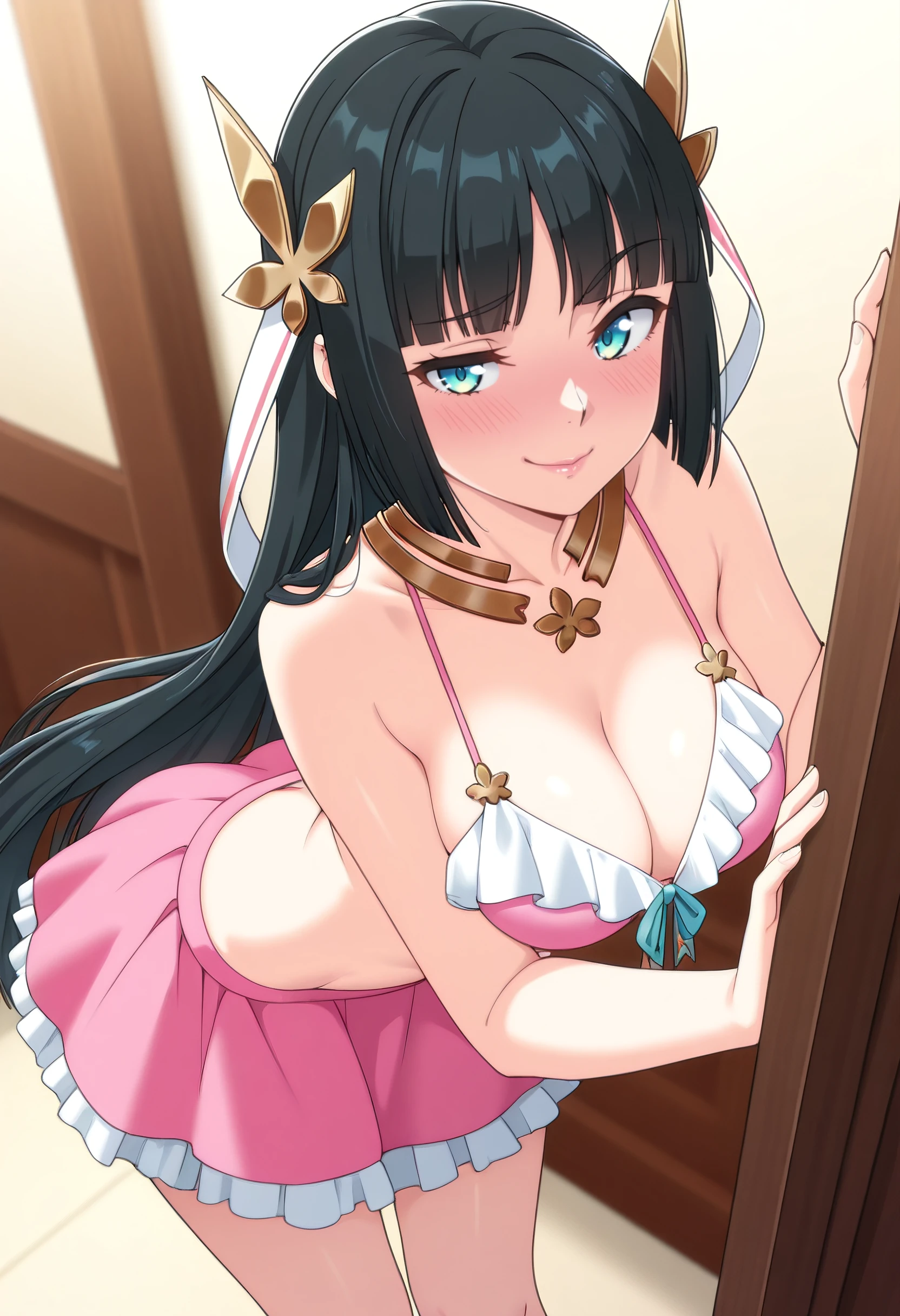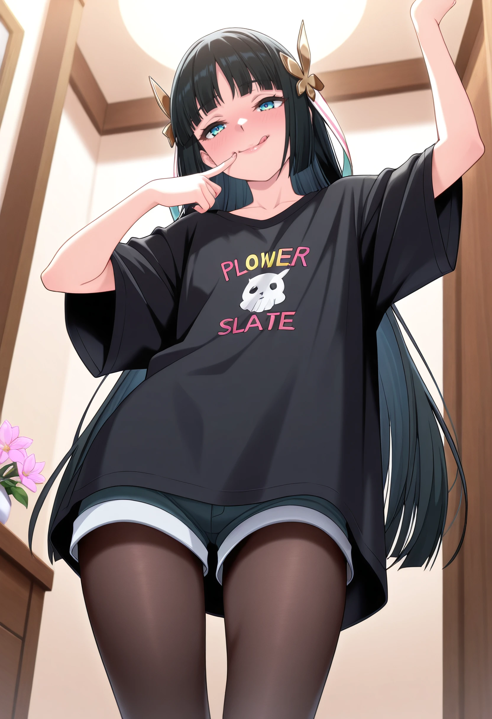 TNSMilena, black hair, hair ornament, long hair, blunt bangs, blue eyes, hime cut, flower, hair flower,