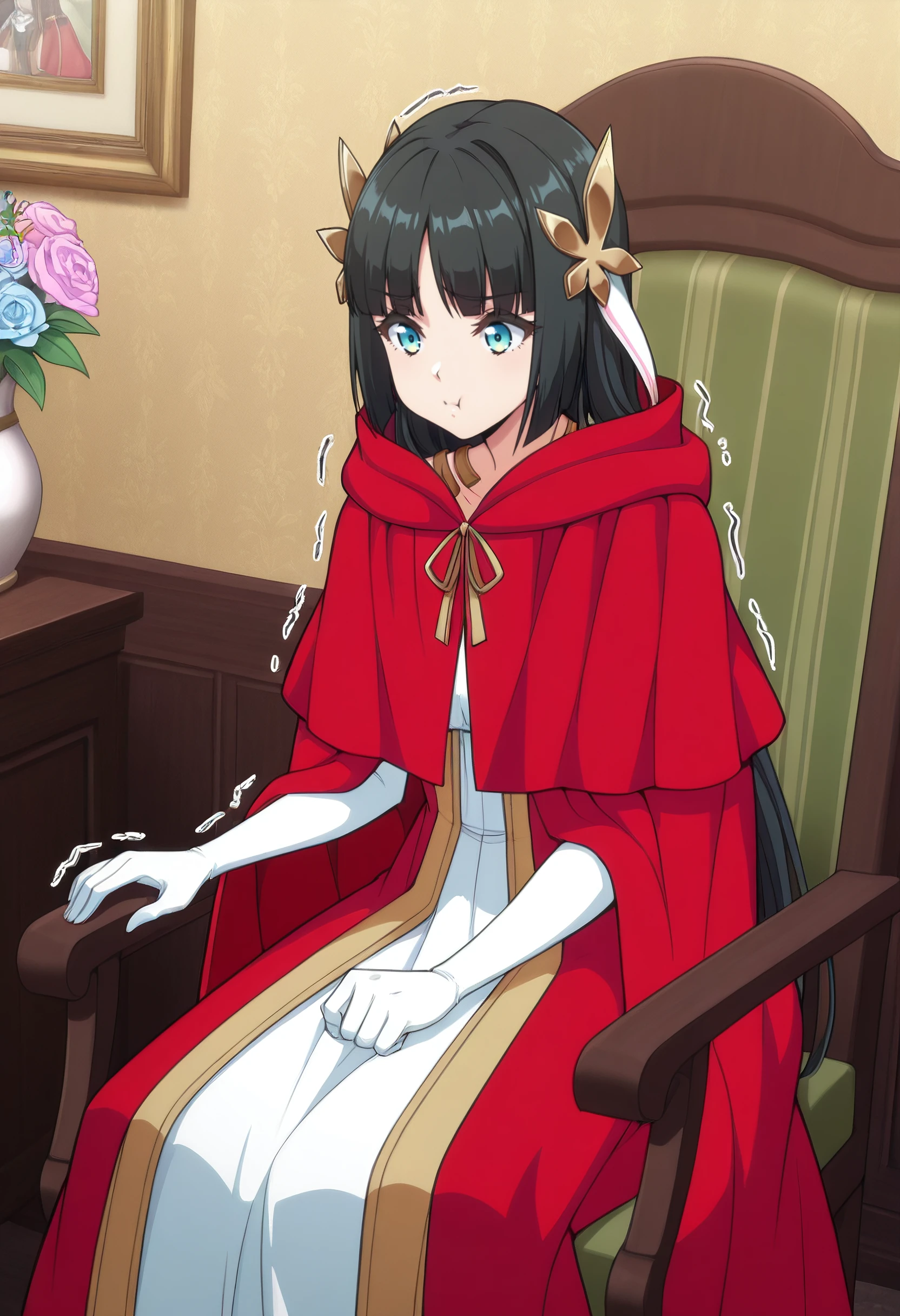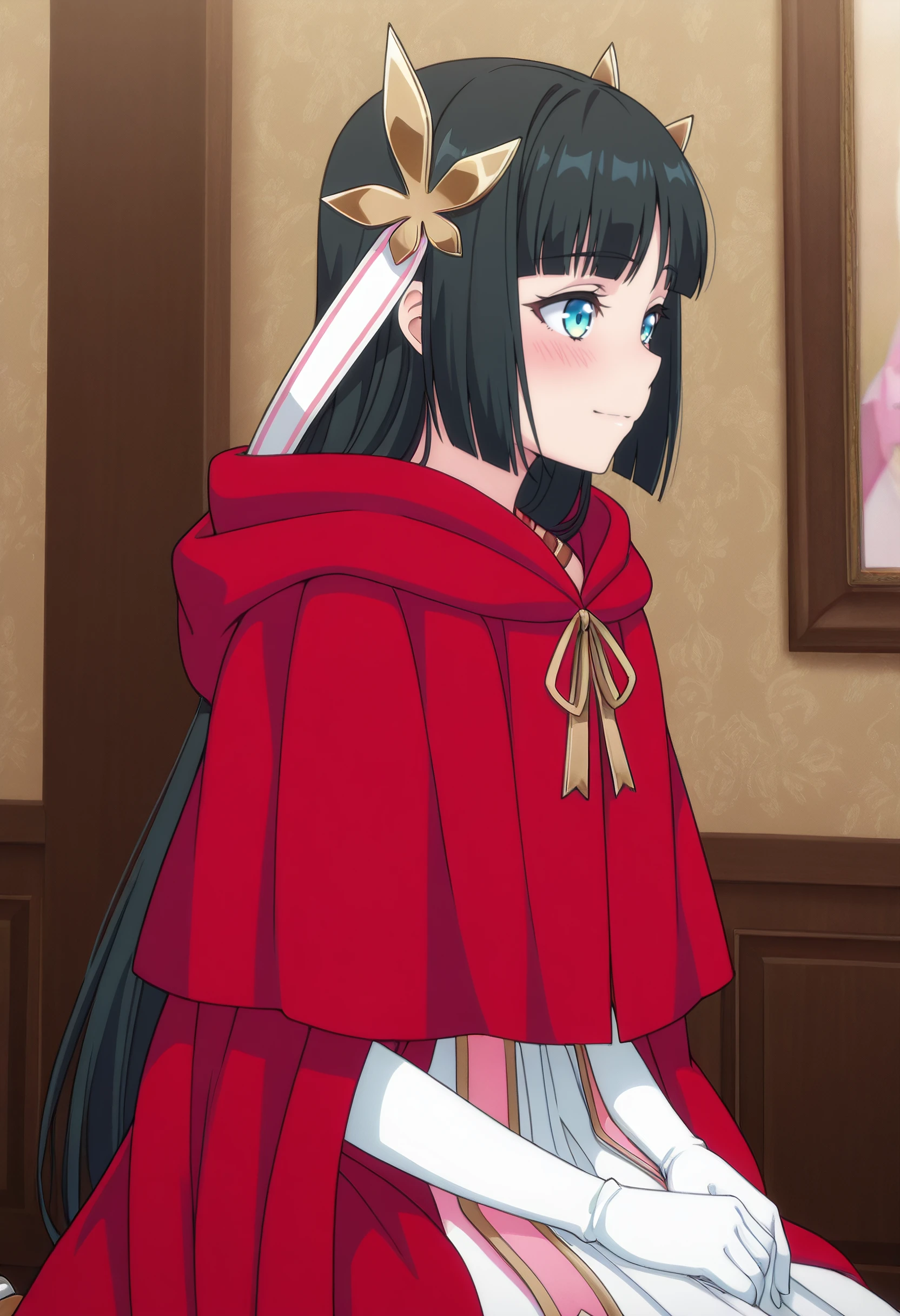 MilenaCape, cloak, hood, red cloak, ribbon, cape, red hood, red capelet, dress, red cape, capelet, hooded cloak, hood down, long sleeves, white dress, hair ribbon, white ribbon, red robe, hooded capelet, robe, gloves, white gloves,