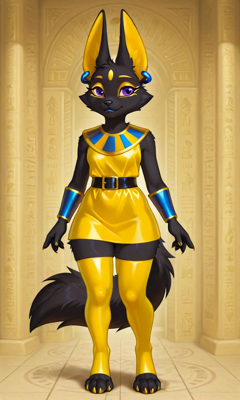body fur, short dress, yellow mark on forehead, egyptian, 1girl, soloDescription