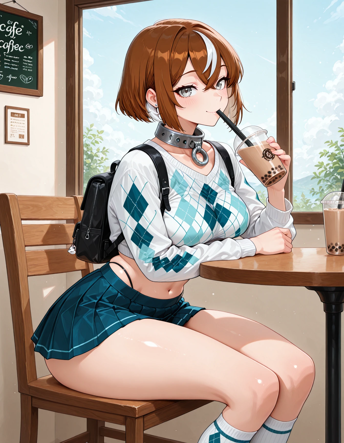 femboy, short hair, two tone hair, brown hair, white streaks, grey eyes, collar, platform mary janes, argyle sweater, knit sweater, pleated microskirt, white knee socks, panties, small panty bulge