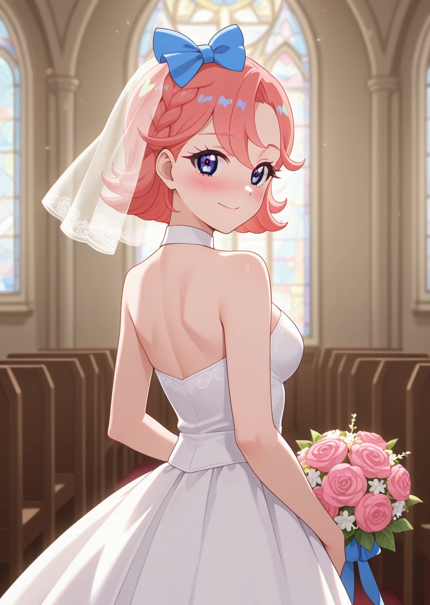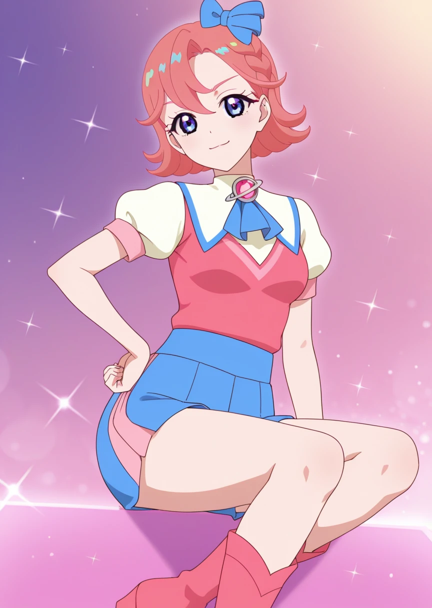 otomeaipri, pink hair, short hair, braided, hair ribbon, blue eyes, pink shirt, ascot, blue shorts, pink boots, hand on hip,