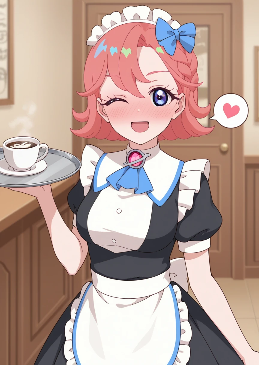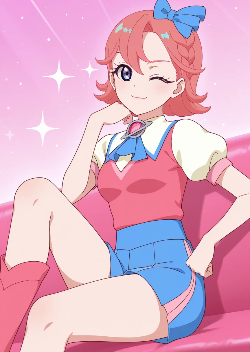 Aipri: otomeaipri, pink hair, short hair, braided, hair ribbon, blue eyes, pink shirt, ascot, blue shorts, pink boots, hand on hip,