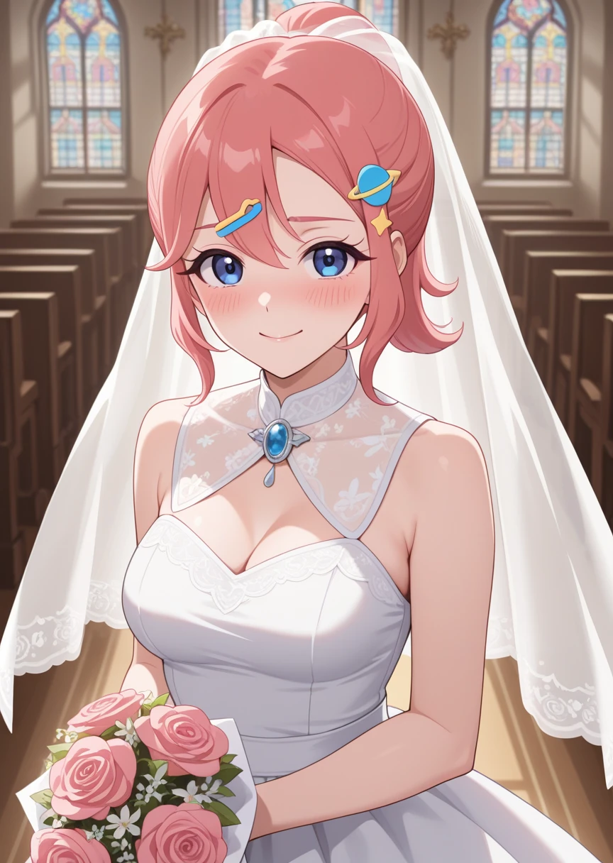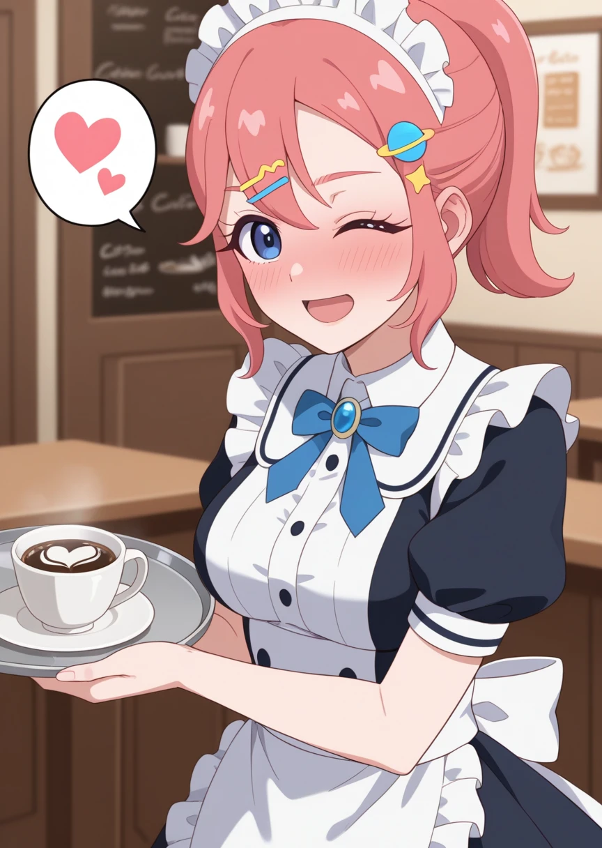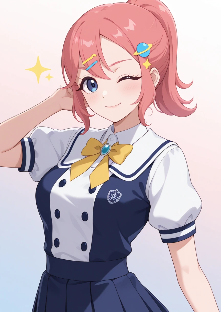 Otome Nanaura, pink hair, ponytail, hair ornament, blue eyes, school uniform, neck accessory, dress, blue skirt,