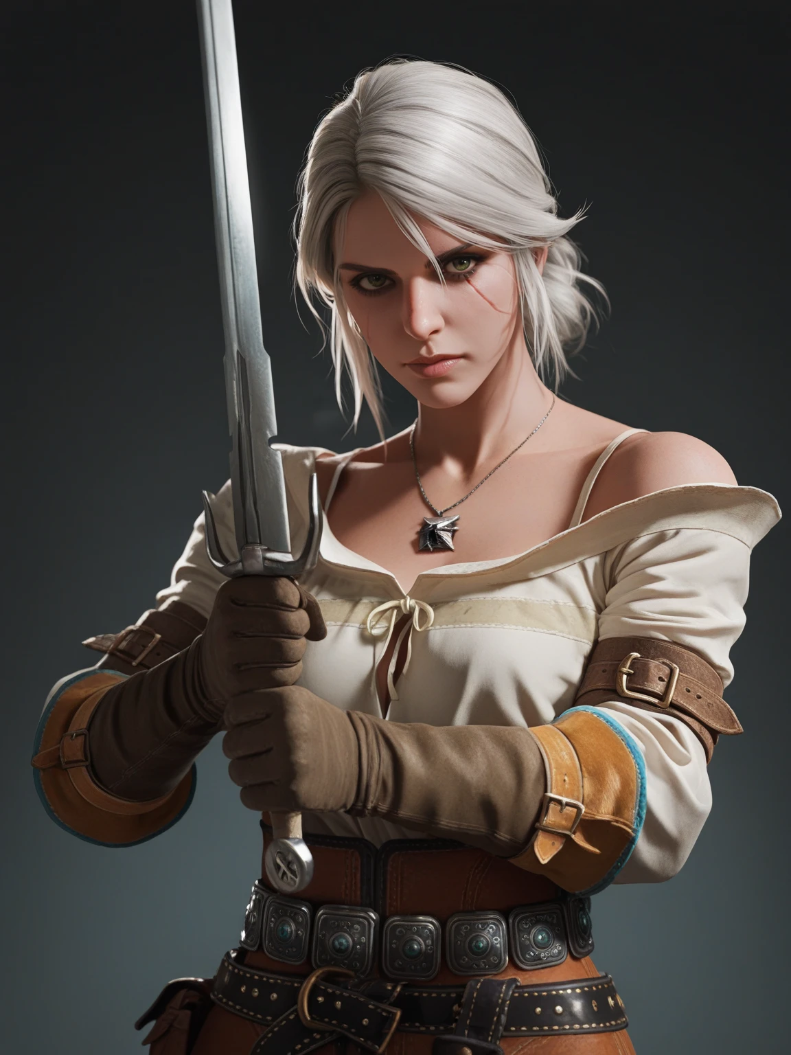 tw3ciri, outfit1, 1girl, white hair, hair bun, scar across eye, green eyes, necklace, off shoulder shirt, white shirt, brown gloves, belt, pants