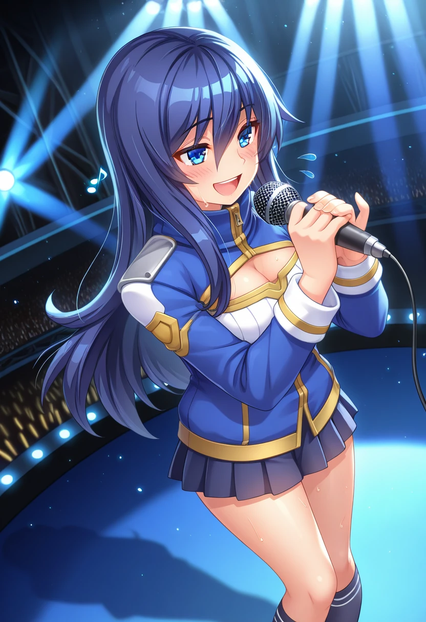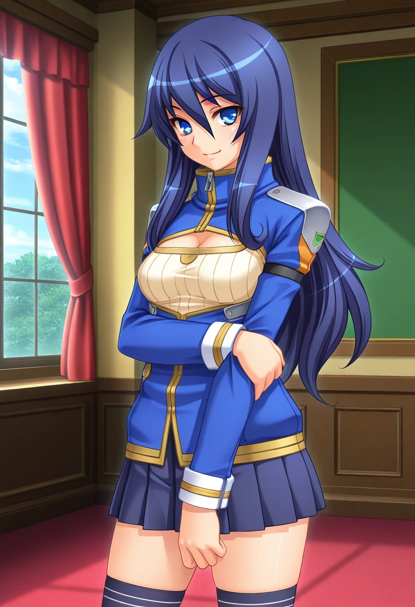 konoe gakuen uniforms, breasts, cleavage, blue jacket, sweater, dark blue pleated skirt, black kneehighs, loafers,