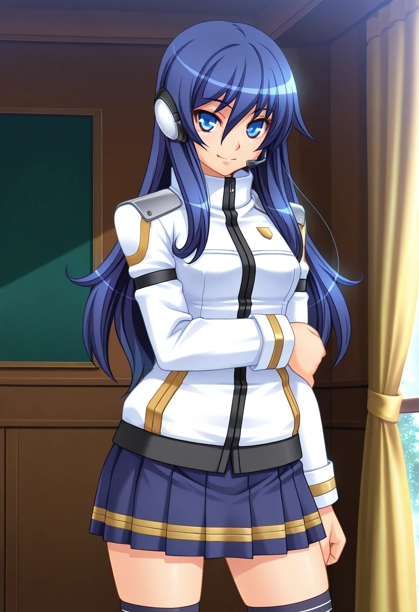 konoe gakuen uniforms, white jacket, headset, dark blue pleated skirt, black kneehighs, loafers,