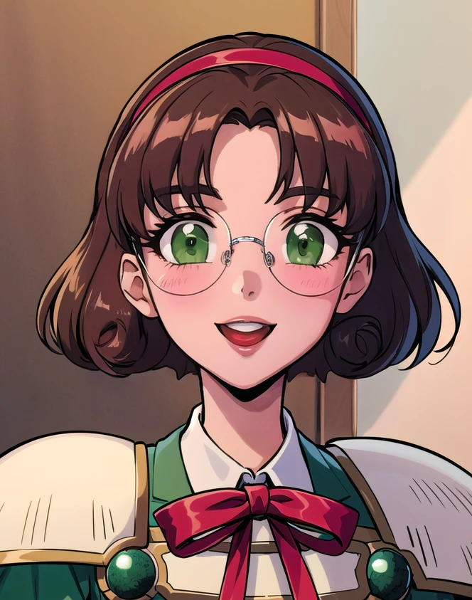 fuu_hououj1, green eyes, brown hair (or) blonde hair, short hair, curly hair, parted bangs, glasses, round eyewear, rimless glasses