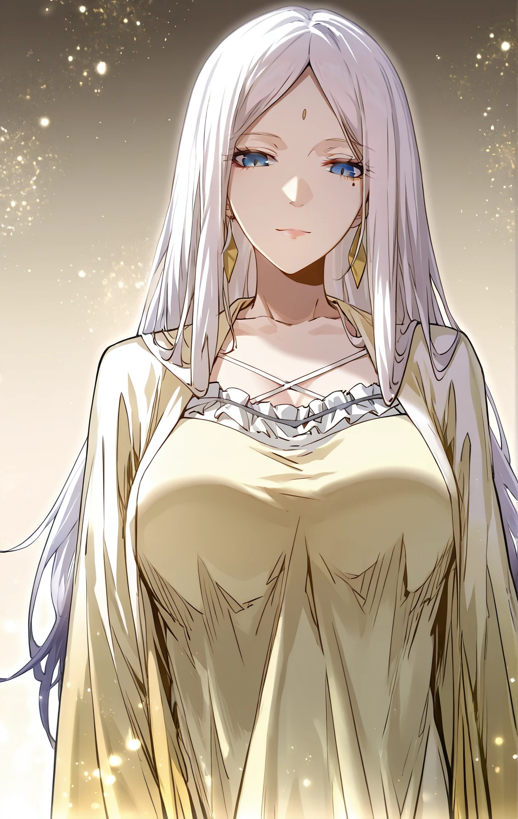 Xixuan, 1girl, solo, blue eyes, white hair, long hair, parted bangs, loose hair, forehead mark, under eye mole, beauty mark, long earrings, gold earrings,