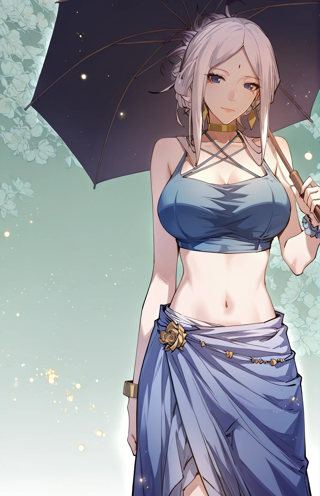 Xixuan_outfit2, blue top, halter top, cross strap top, sleeveless top, gold waist ornament, midriff, crop top, blue skirt, wrap skirt, long skirt, asymmetrical skirt, high slit skirt, gold choker, ruffled bracelet, blue sandals, blue umbrela, hand umbrella