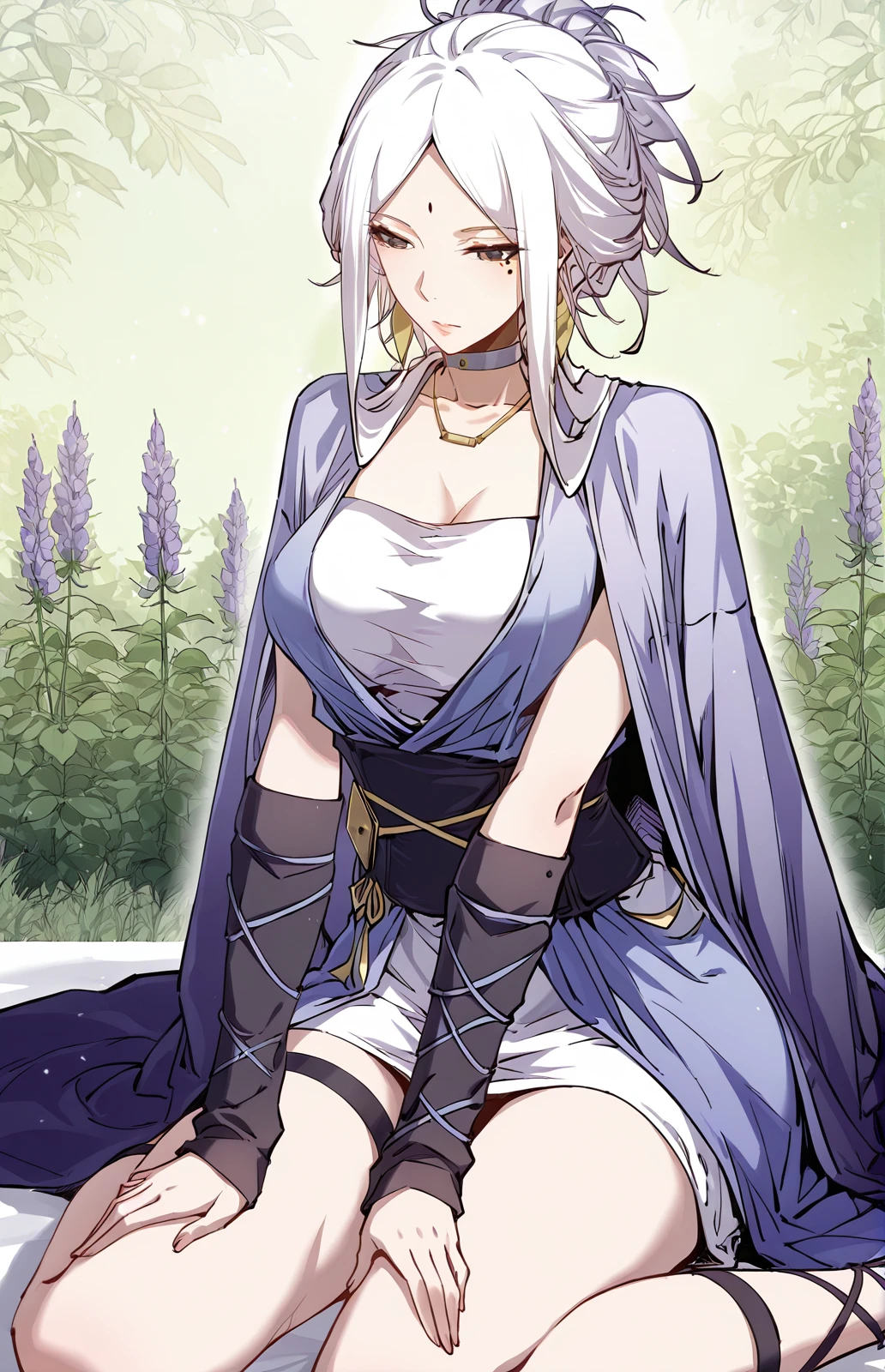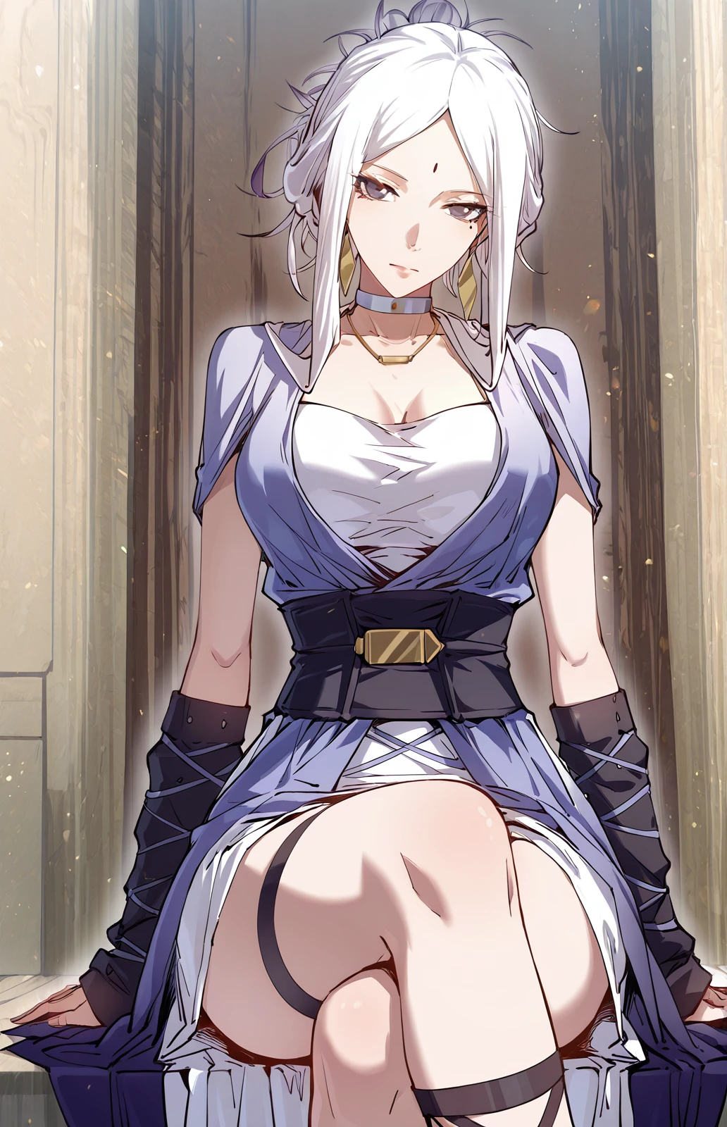 Xixuan_outfit1, lavender robe, elbow sleeves, open robe, white inner dress, sleeveless dress, short dress, blue choker, gold necklace, dark purple waist sash, wide waist sash, black arm warmers, tied arm warmers, black thigh strap, cross laced sandals,