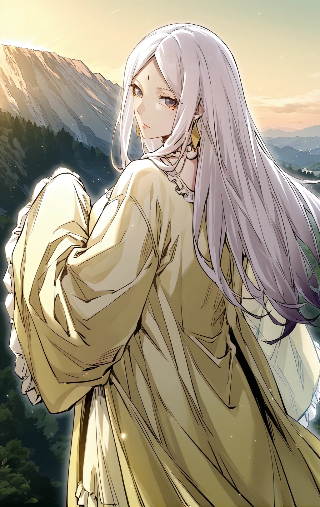 Xixuan, 1girl, solo, blue eyes, white hair, parted bangs, hair bun, forehead mark, under eye mole, beauty mark, long earrings, gold earrings,