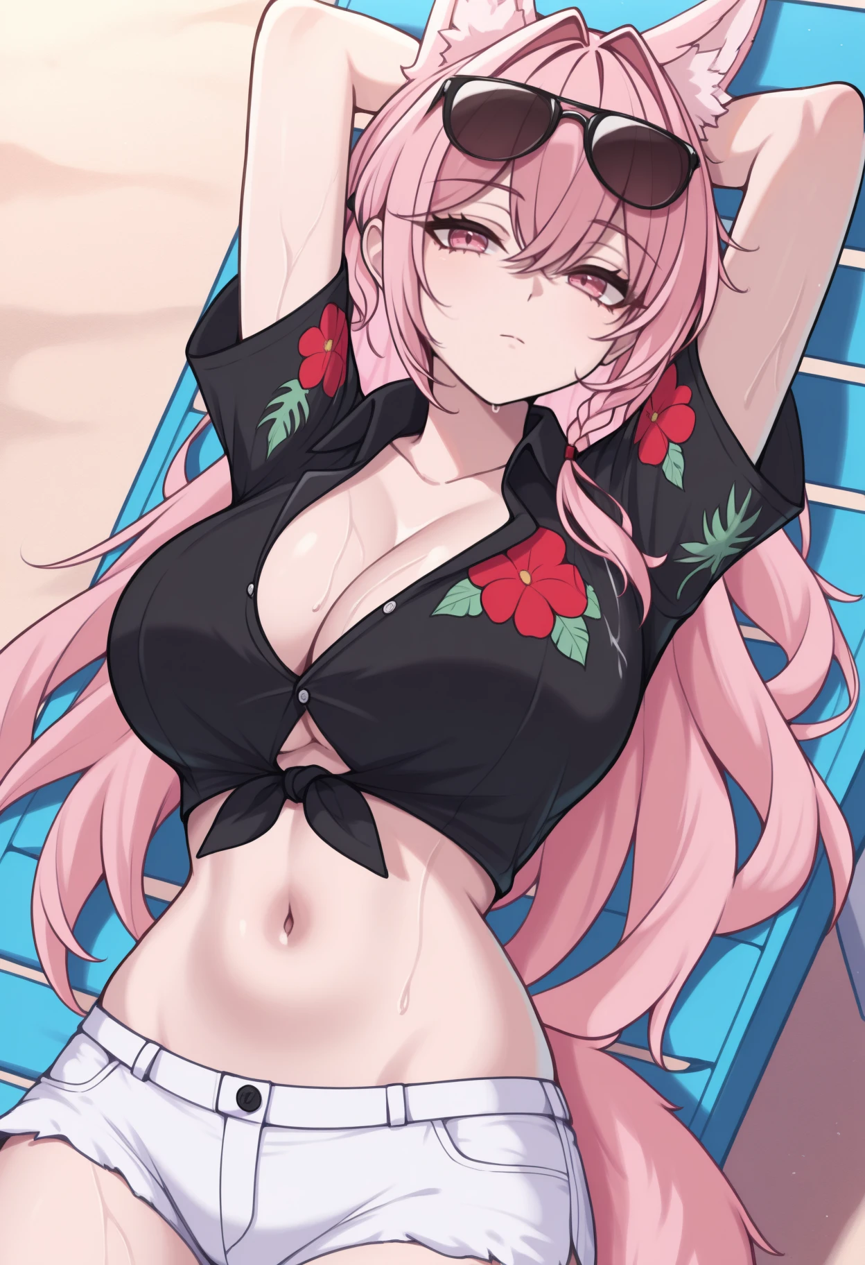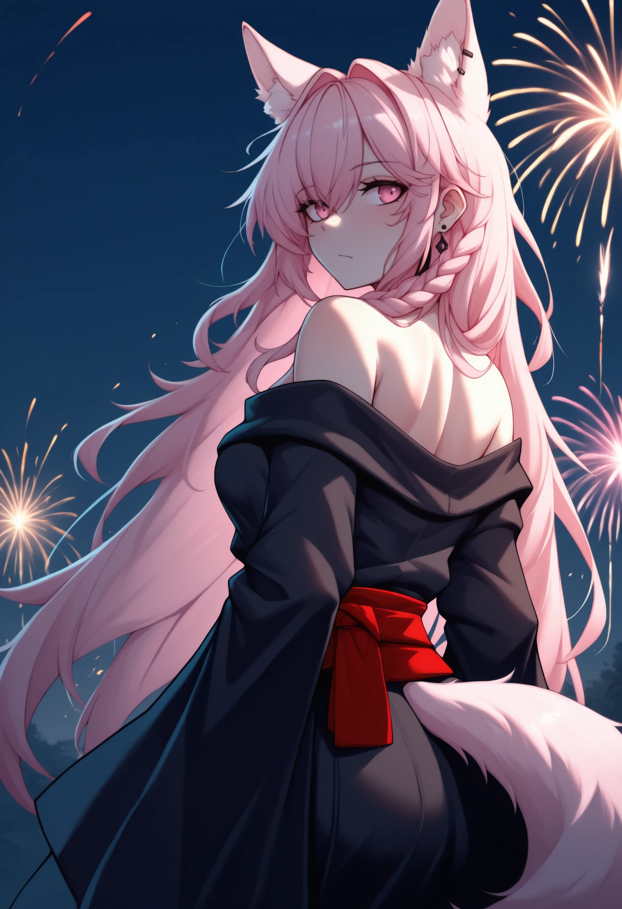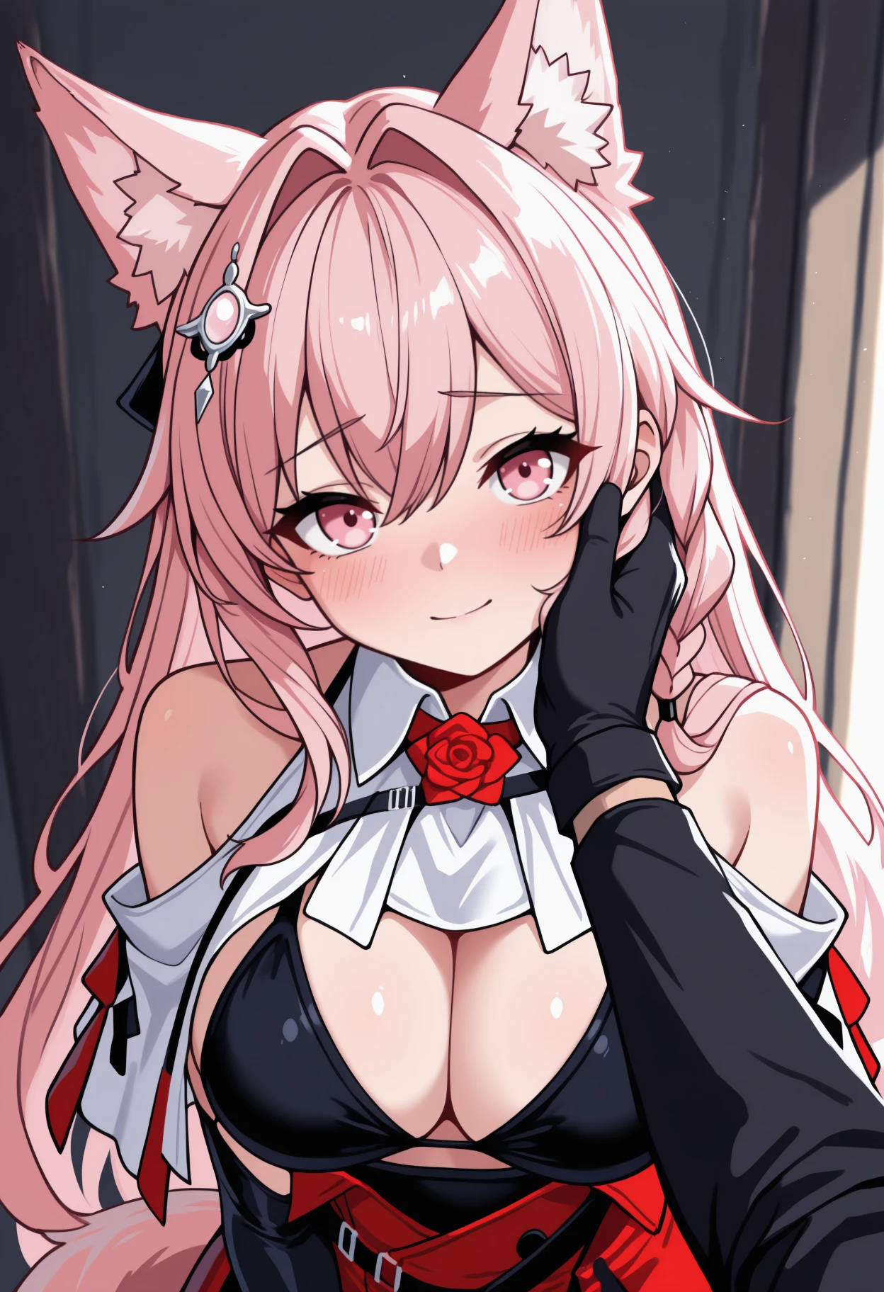Default Outfit: pzmkdef, wolf tail, long hair, pink hair, hair intakes, hair between eyes, side braid, hair ornament, animal ears, animal ear fluff, extra ears, pink eyes, white capelet, collared capelet, clothing cutout, shoulder cutout, red rose, black bikini, bikini top only, black gloves, elbow gloves, red skirt, high-waist skirt, thigh strap, leg ribbon, bare shoulders, cleavage