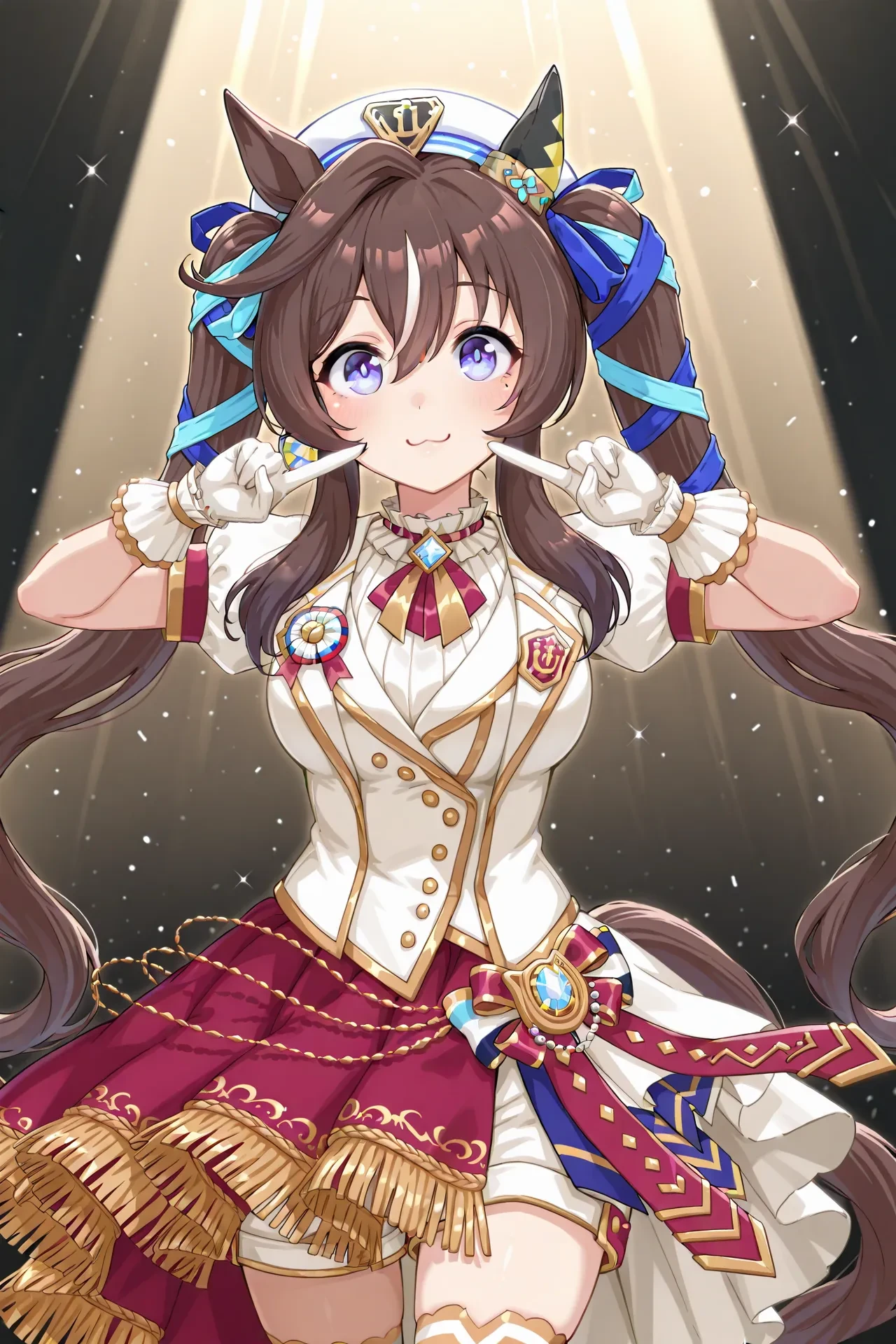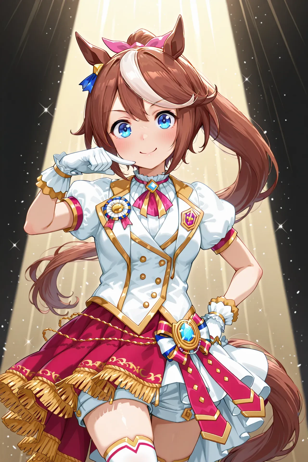 official alternate costume,puffy short sleeves,white jacket,brooch,neck ribbon,white shirt,white gloves,buttons,medal,gold trim,white over-kneehighs,fringe trim,high heel boots,white footwear,