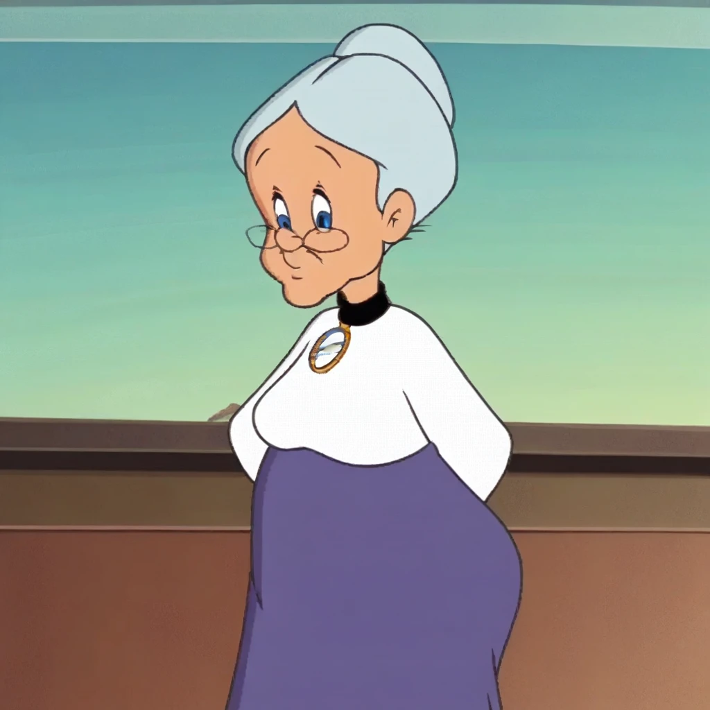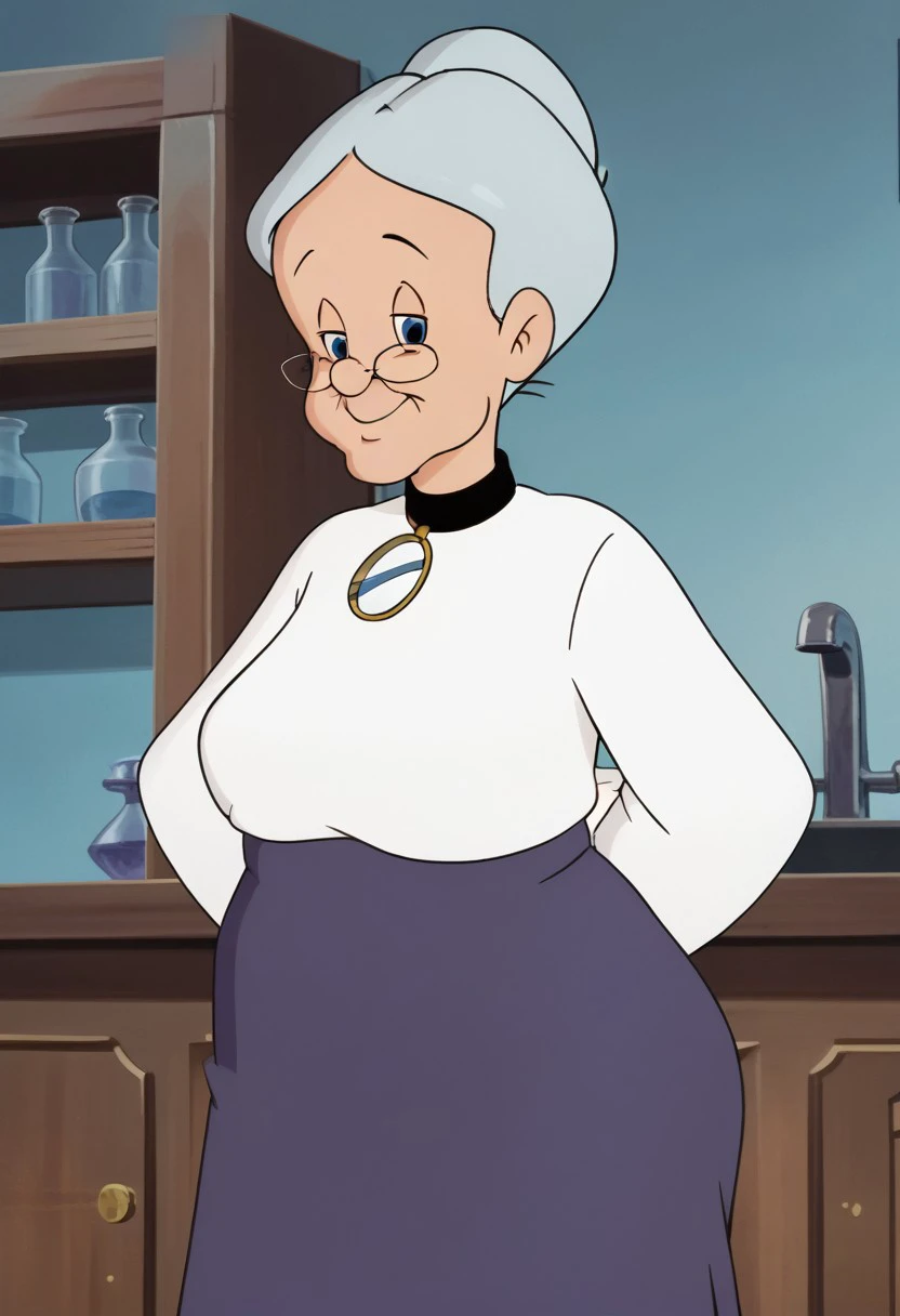 2d, flat colours, animated drawing, cartoon character, 1girl, ltgran, short hair, old woman, granny, solo, glasses, single hair bun, hair bun, gray hair, white shirt, long sleeves, jewelry, long skirt, blue skirt, breasts, large tits, booty, large butt, wide hips, busty