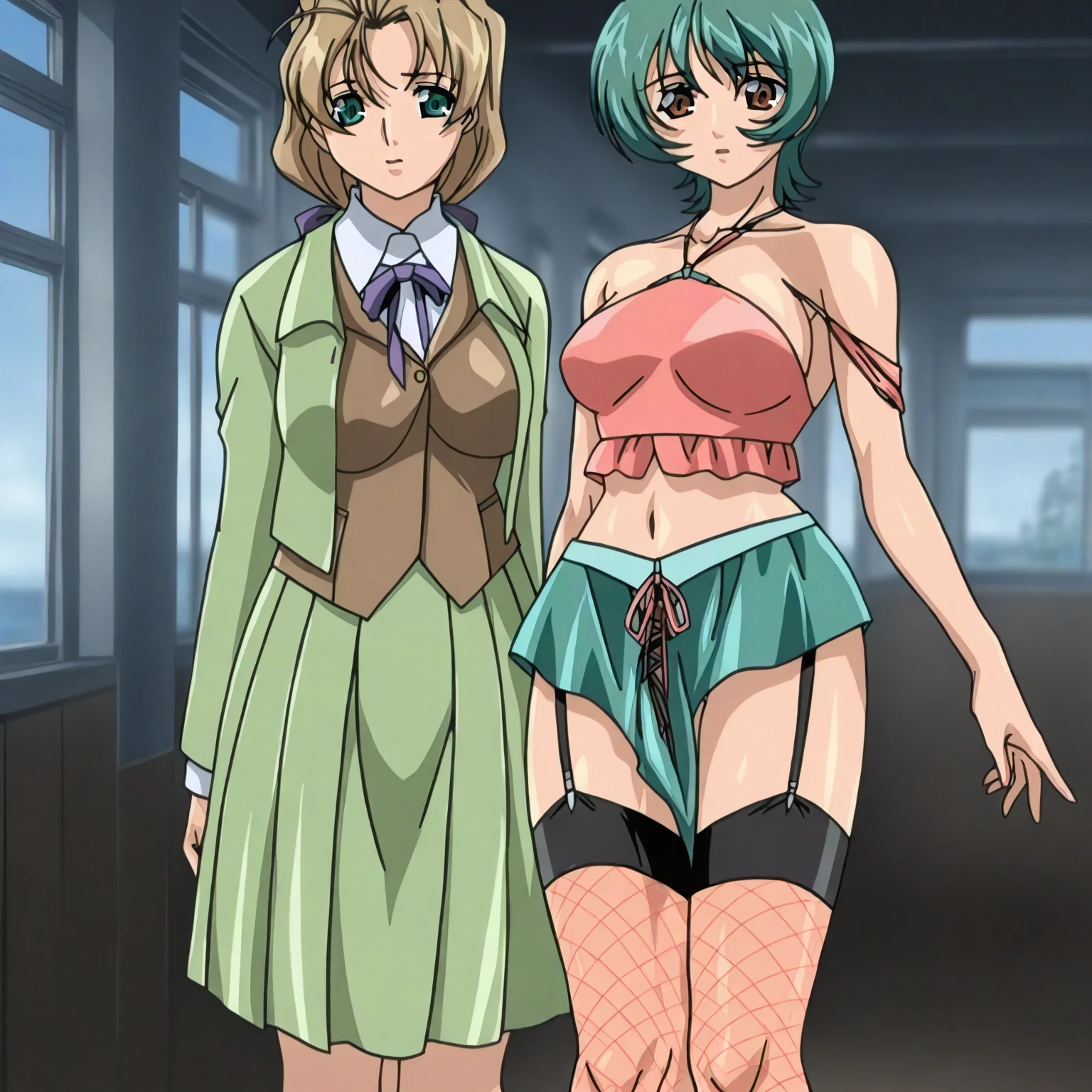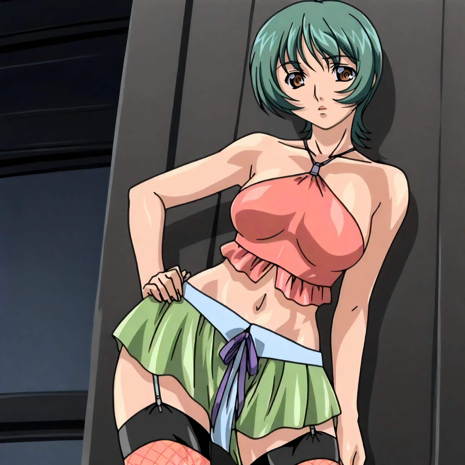 halterneck,pink crop_top, microskirt,green skirt, garter straps,fishnet_thighhighs,
