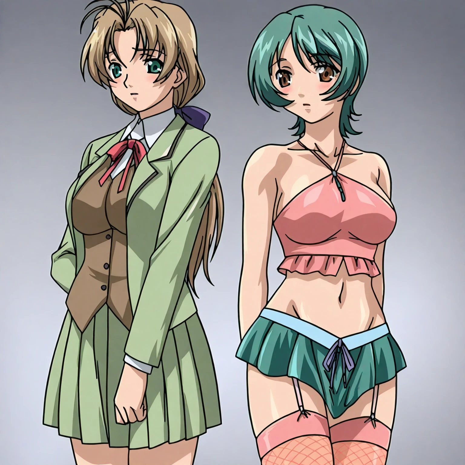 school uniform,green blazer,open jacket,brown vest, green skirt,