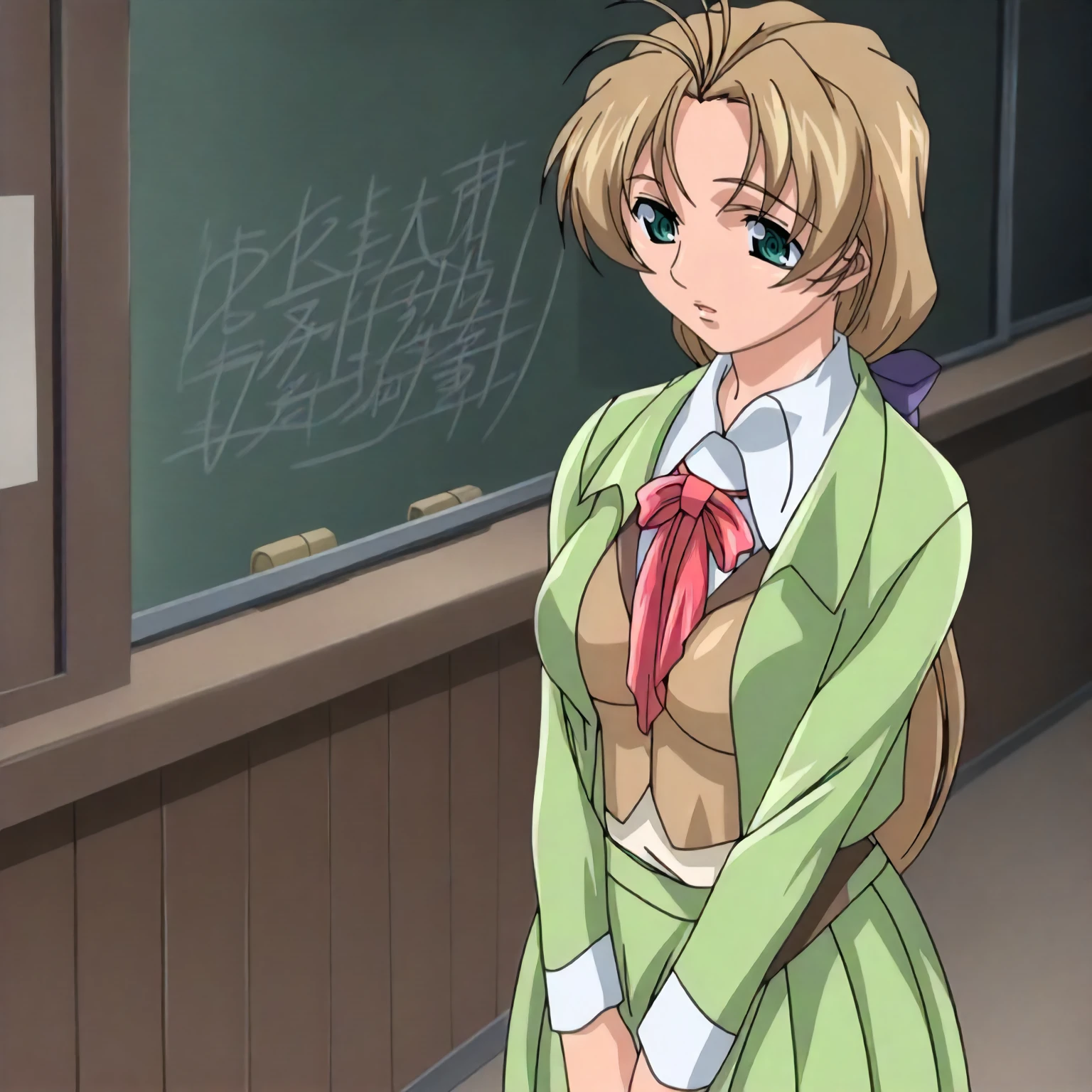 1girl,Yumi is a girl with light brown hair a low ponytail hairstyle and aqua eyes., large breasts,