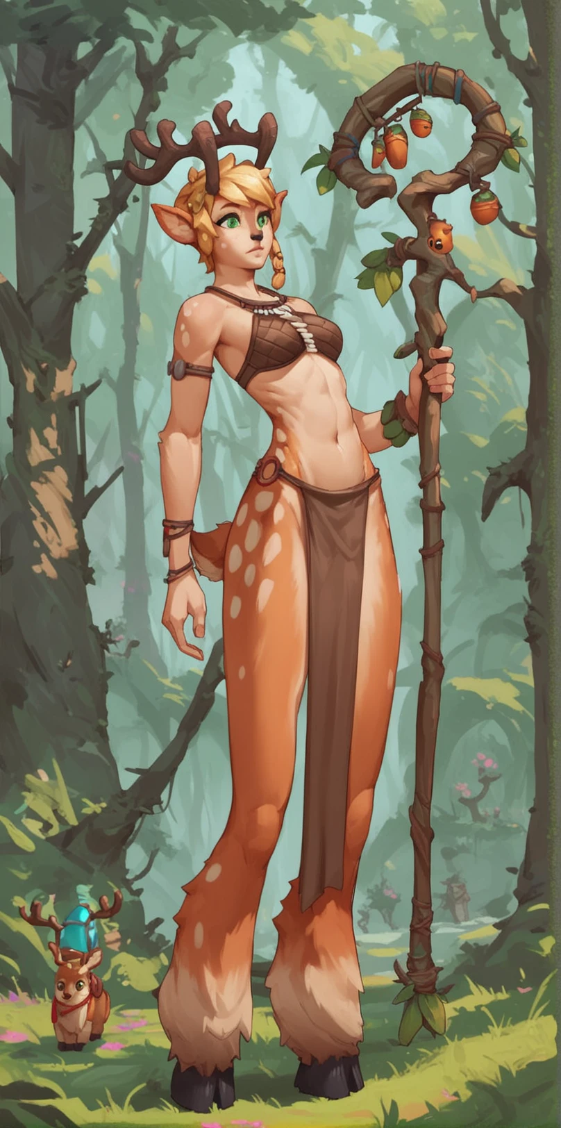 Suggested tags: Battlerite, Blossom, Satyr, Deer Girl, Black Nose, Green Eyes, Bra, Loincloth, Staff
