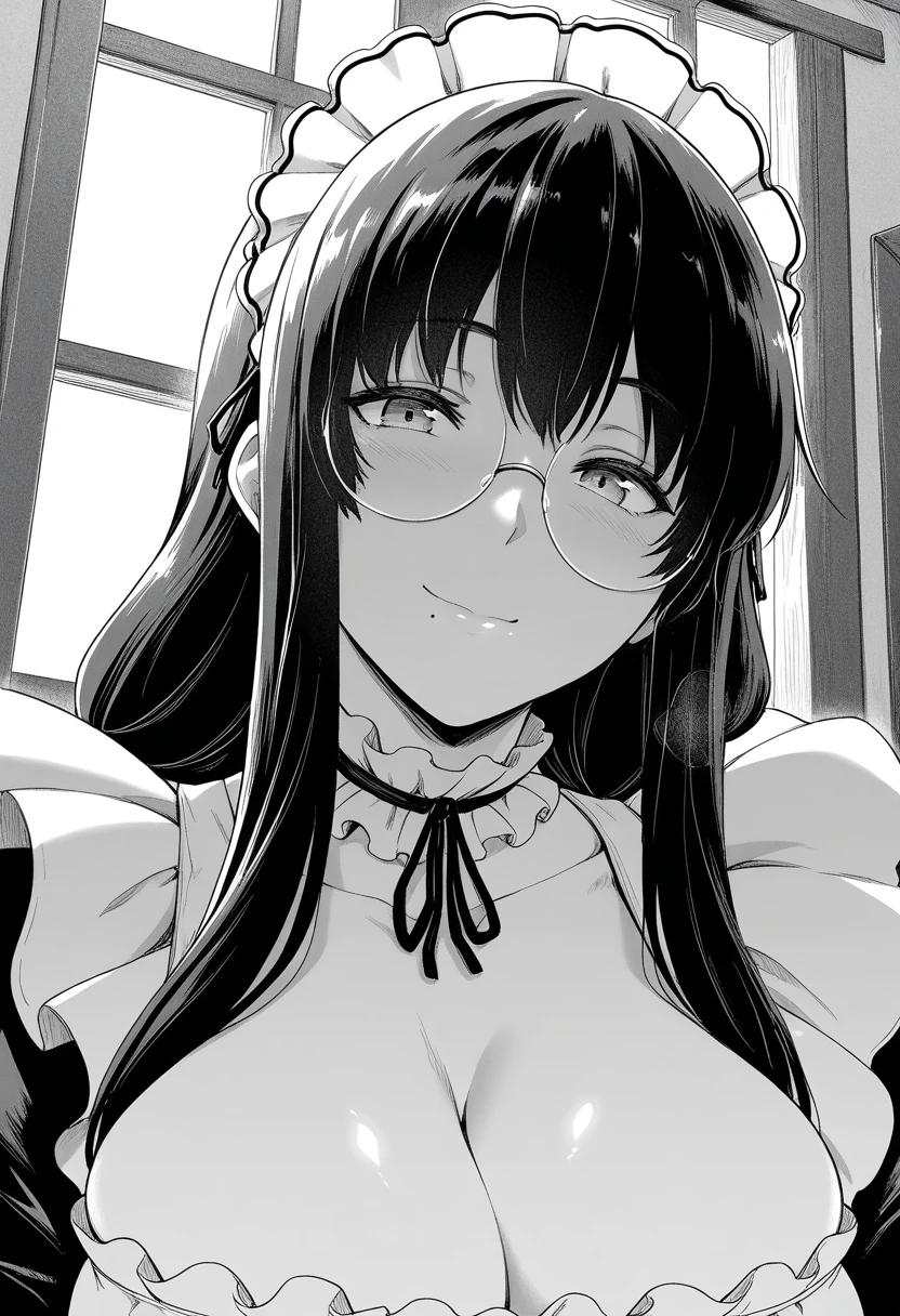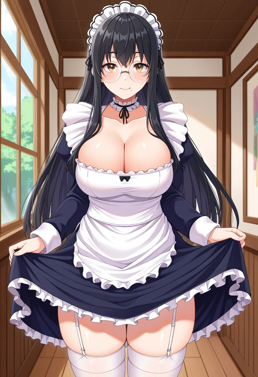 maid, maid headdress, frilled choker, breasts, cleavage, frilled dress, long sleeves, maid apron, thighhighs, garter straps,