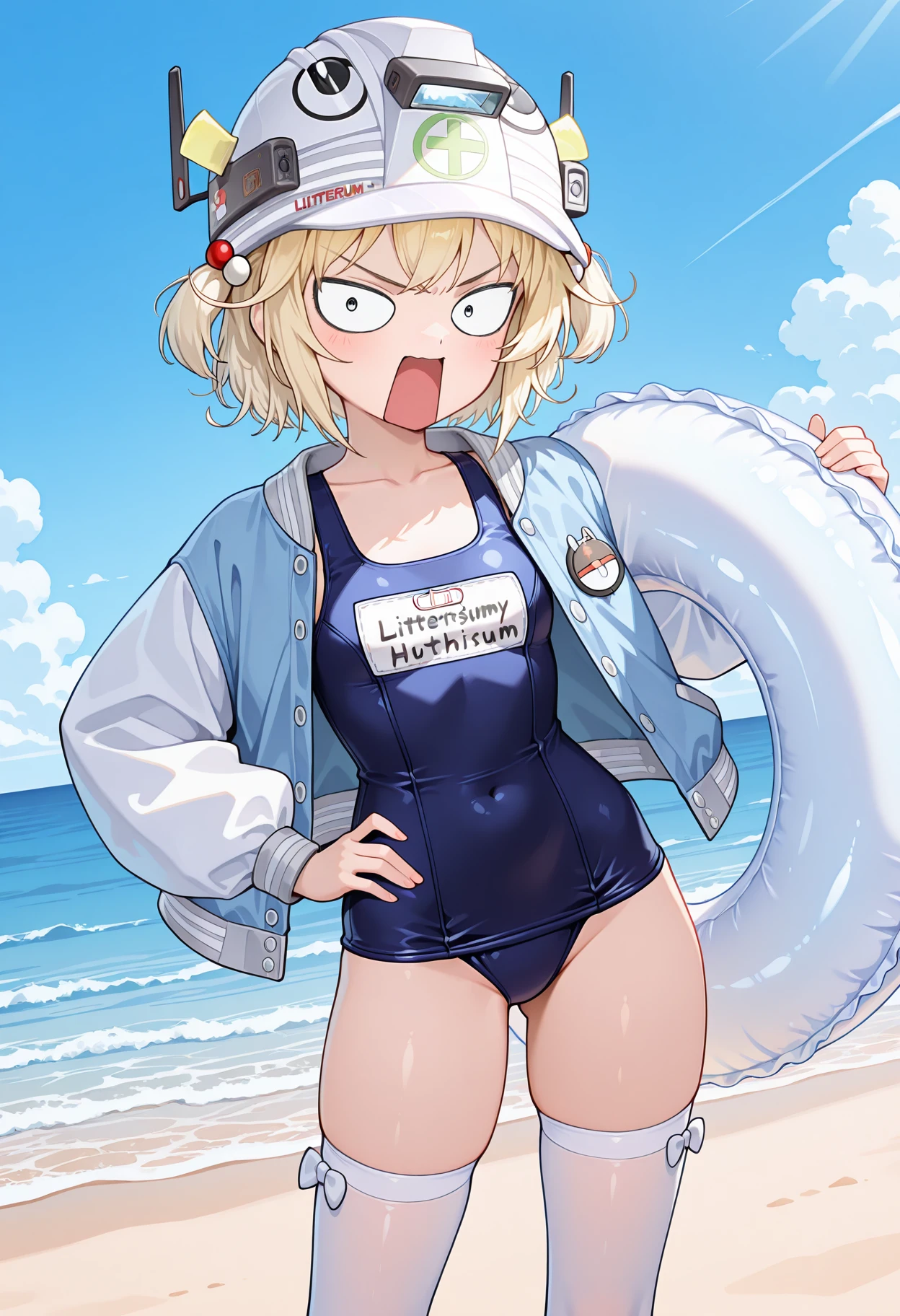 litersum, school swimsuit, name tag, white helmet, hair bobbles, white jacket, open jacket, puffy long sleeves, collarbone, white thighhighs, innertube, holding innertube,