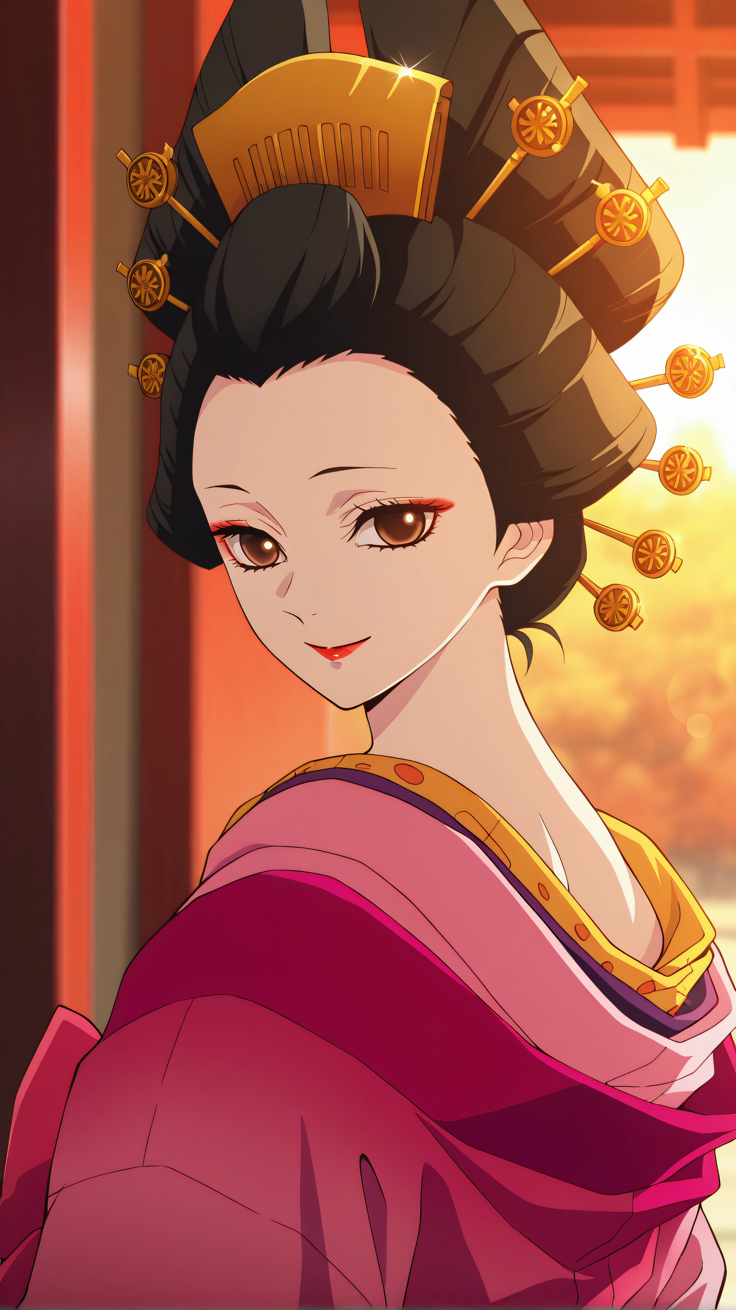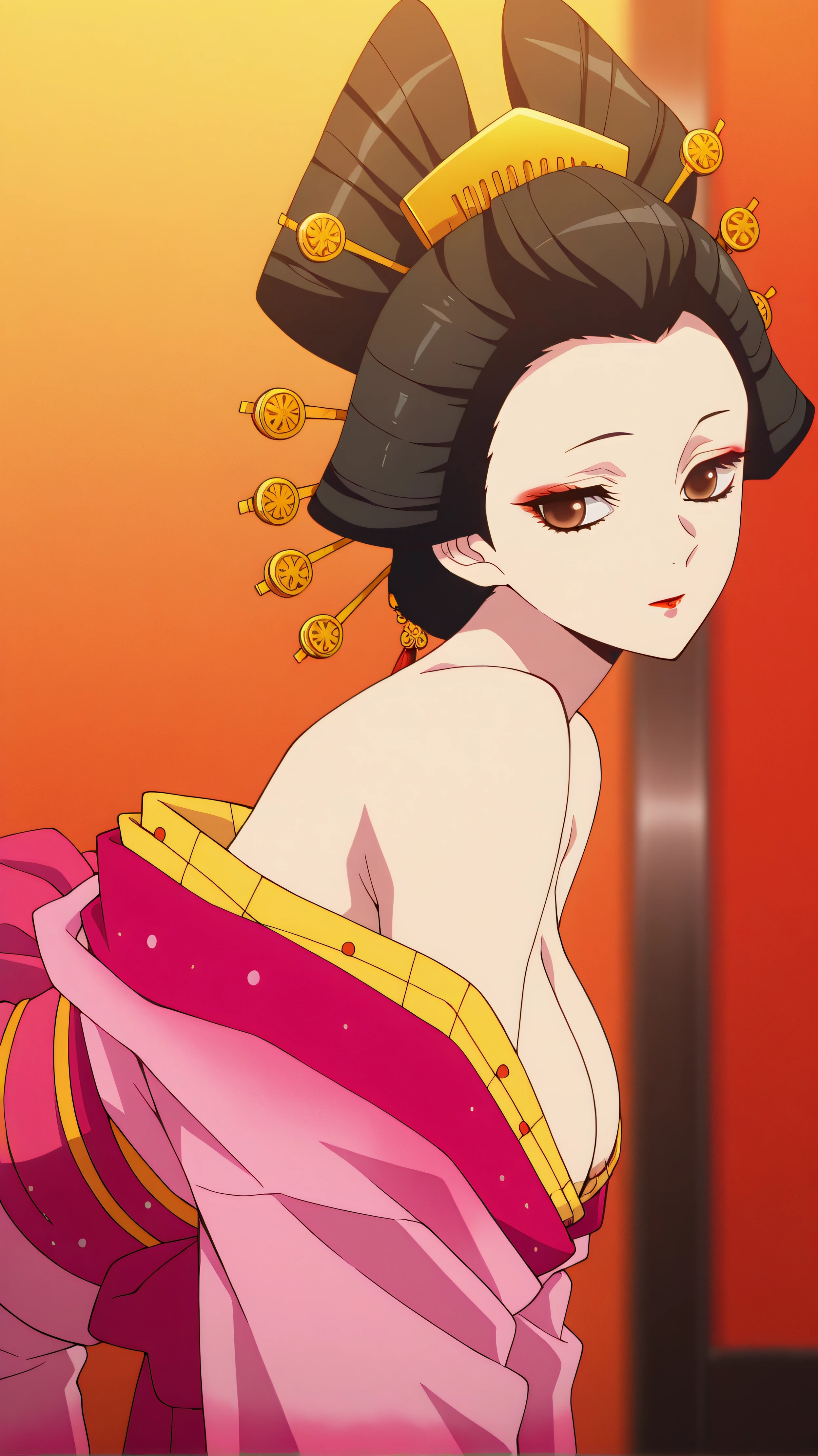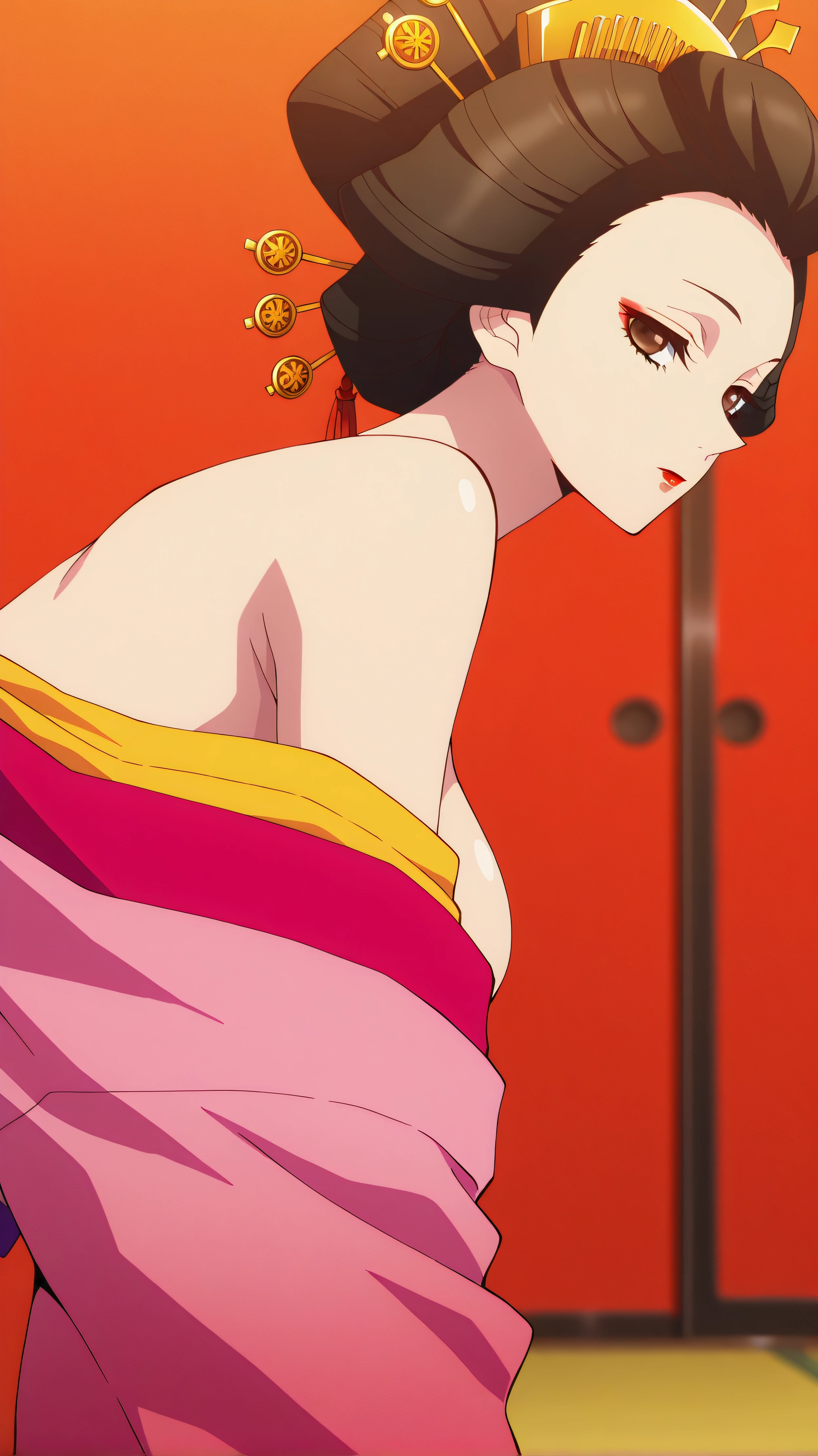 TAG:1girl,solo,koinatsu, hair ornament, brown eyes, black hair, makeup, hair stick, lipstick, kanzashi, updo,