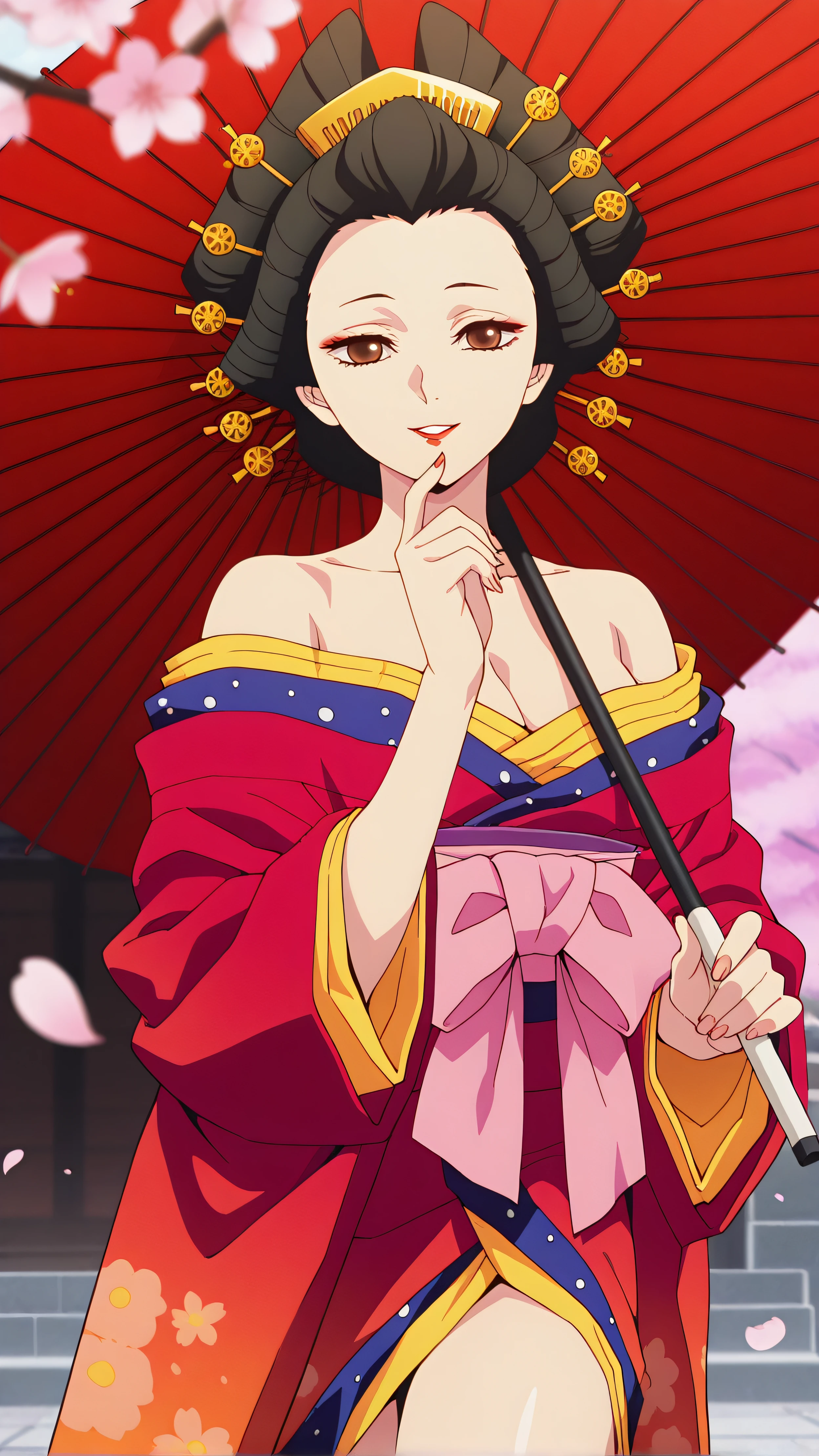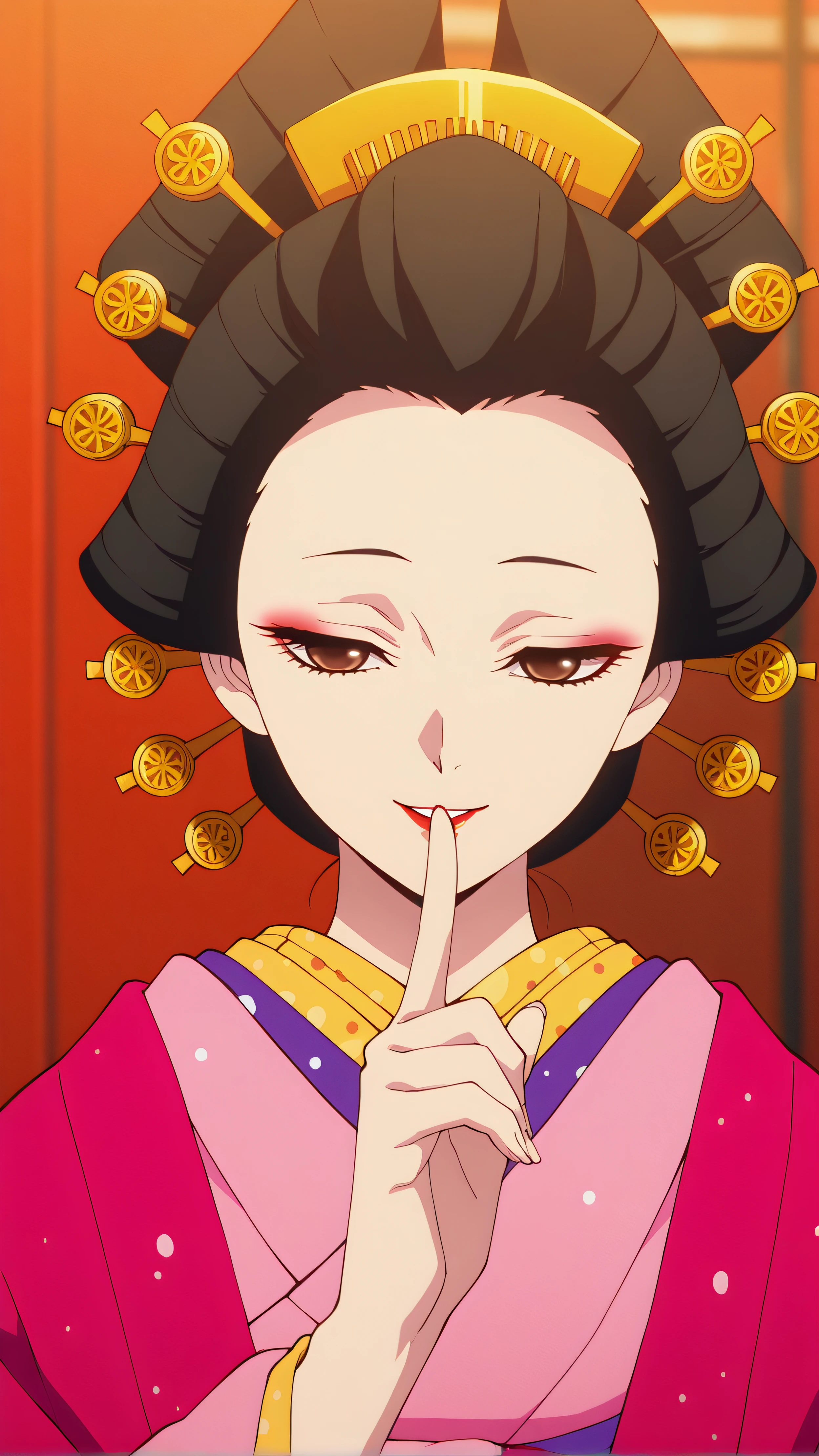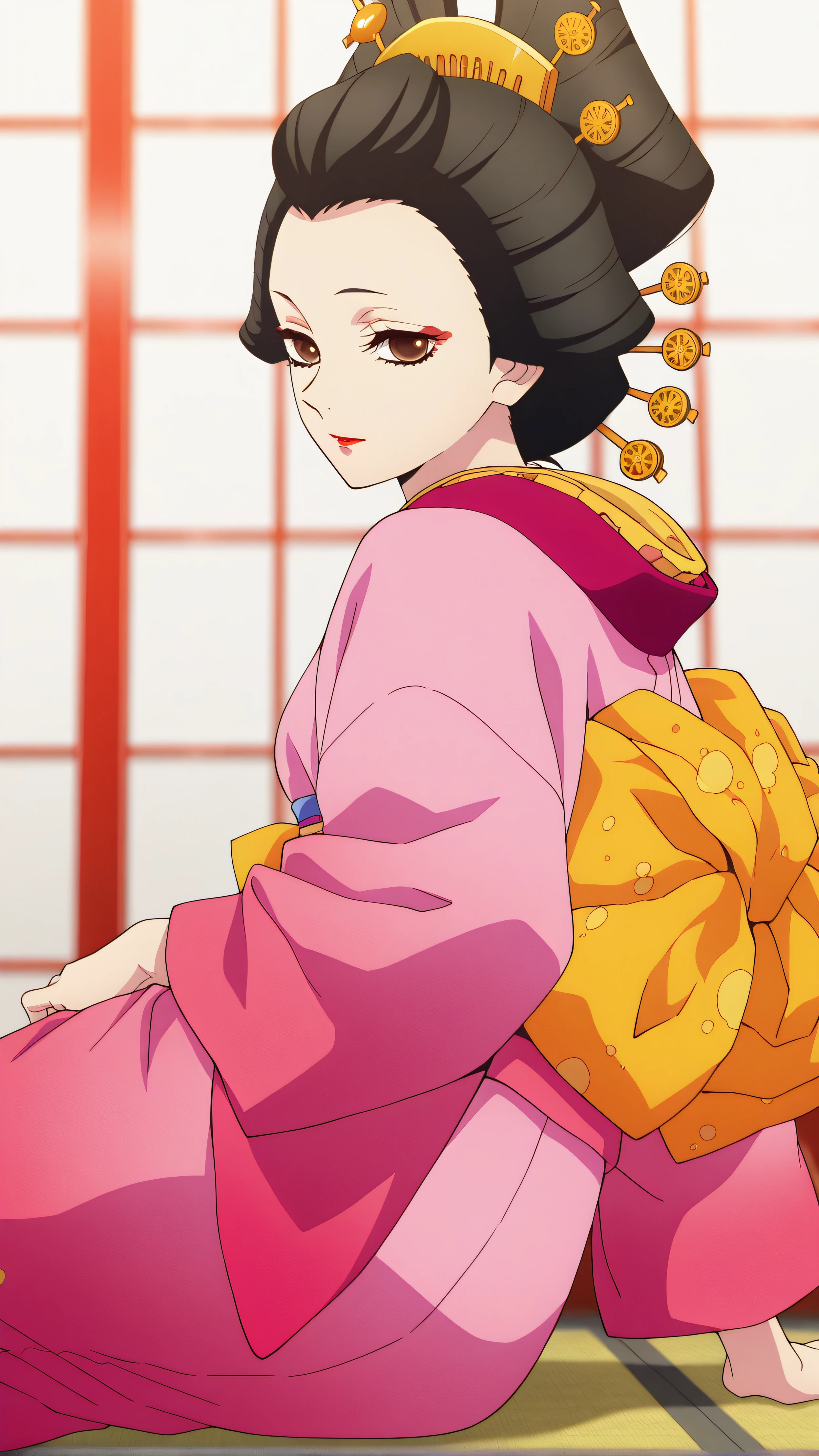 TAG:1girl,solo,koinatsu, hair ornament, brown eyes, black hair, makeup, hair stick, lipstick, kanzashi, updo,