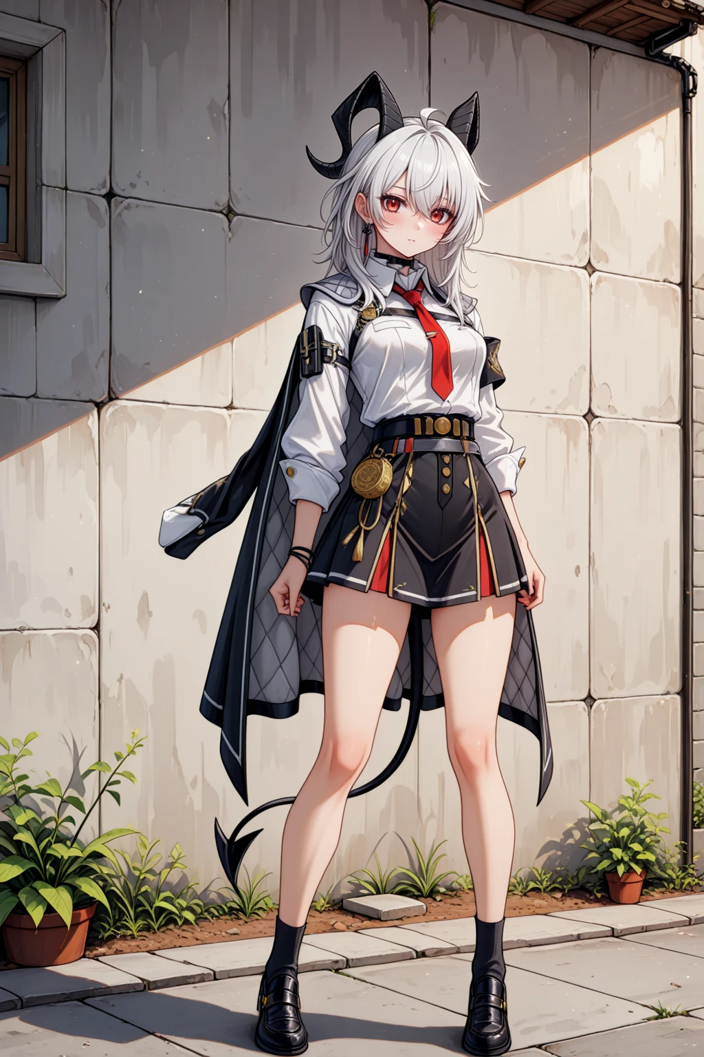 outfit: zani, shirt, breasts, white shirt, necktie, red necktie, gloves, black gloves, large breasts, hair between eyes, high heels, tail,