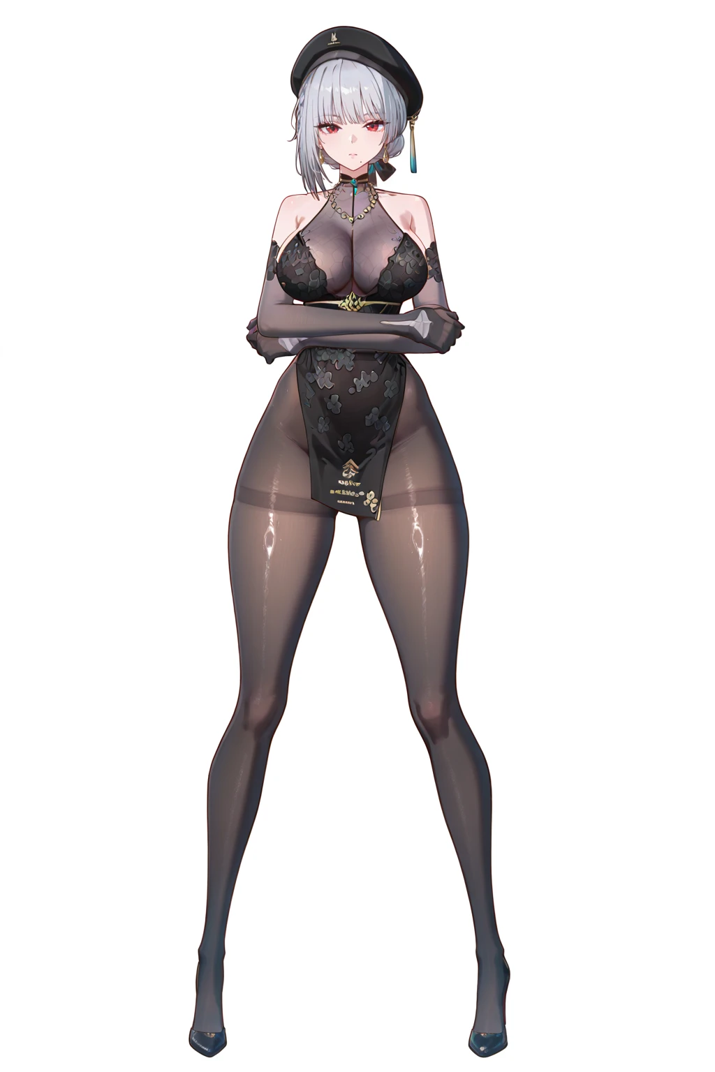 sanhua,1girl,solo,beret,black headwear,short hair,braid,grey hair,red eyes,earrings,jewelry,mole,mole under mouth,breasts,cleavage,necklace,bare shoulders,black dress,chinese dress,black elbow gloves,clothing cutout,floral print,no panties,pelvic curtain,black pantyhose,thighband pantyhose,high heels,see-through,