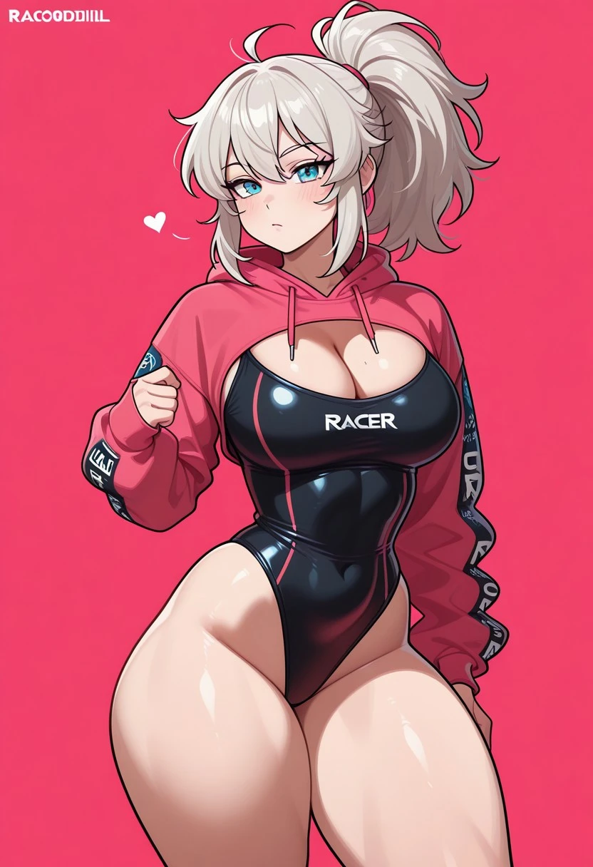 RacerHoodieILL, leotard, cropped hoodie, cleavage, company logos