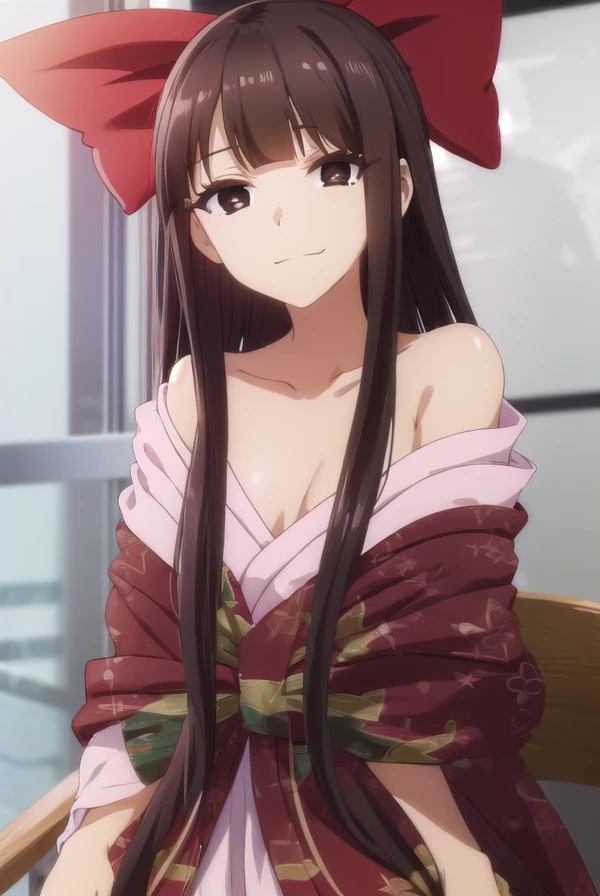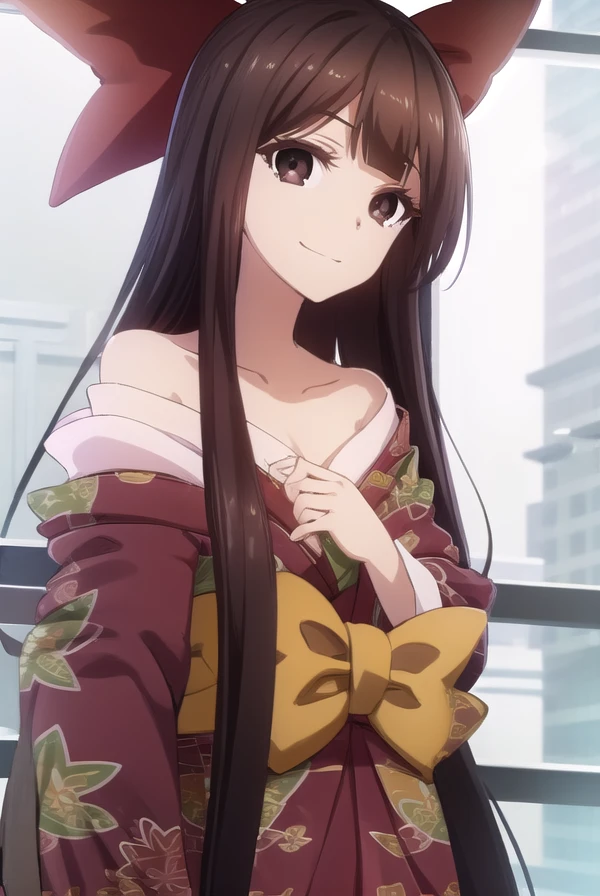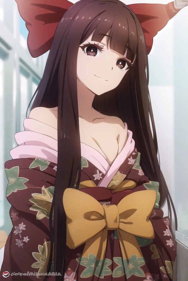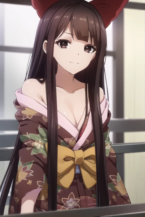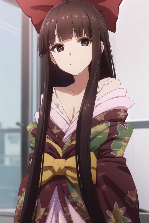 nene saikyou, long hair, bangs, black hair, (brown eyes:1.5), bow, hair bow, blunt bangs, hime cut,