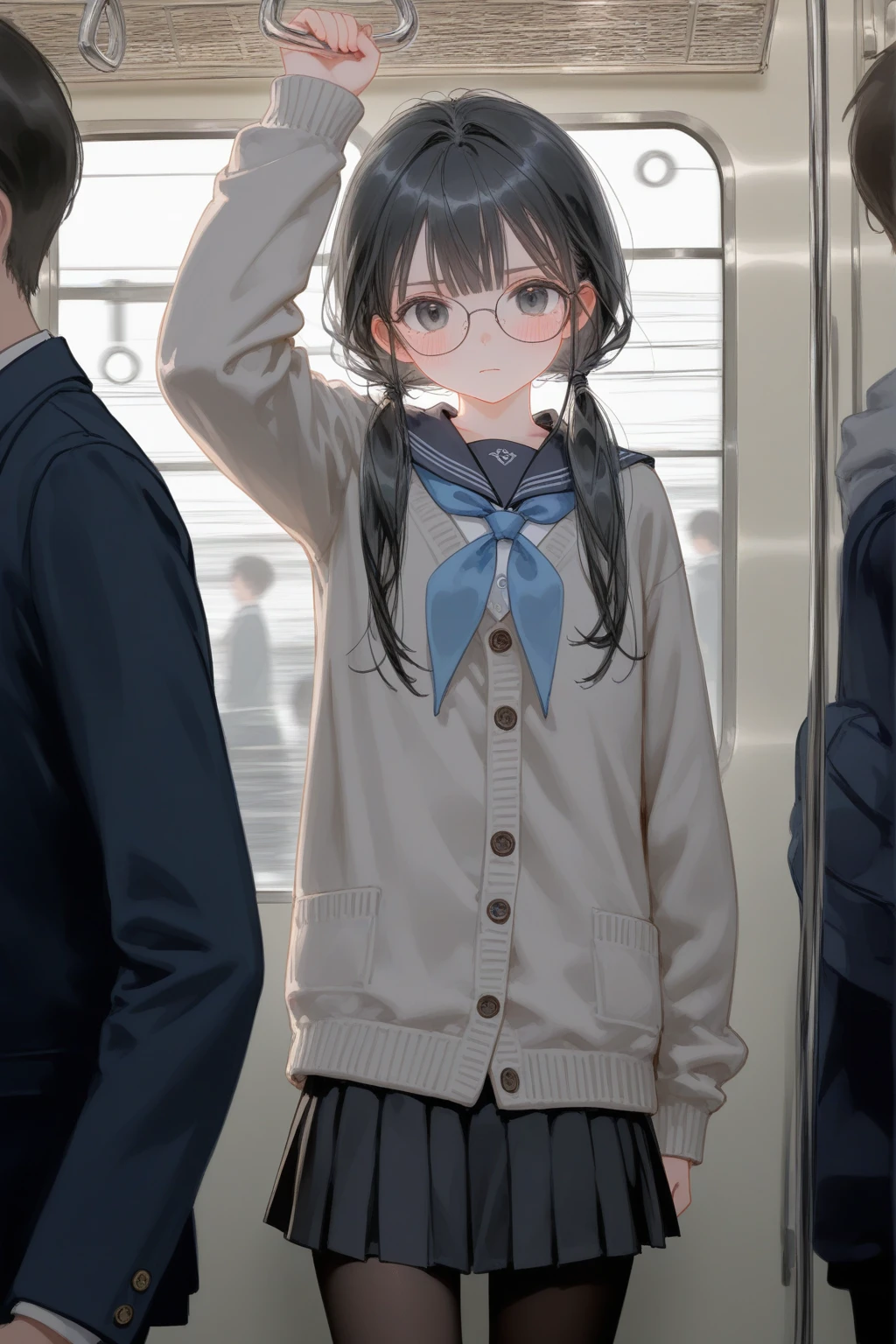1girl,solo,skirt, school uniform, train interior, pantyhose, glasses, neckerchief, sailor collar, black hair, hand grip, twintails, blue neckerchief, pleated skirt, serafuku, long hair, solo focus, cardigan, low twintails, looking at viewer, black skirt, grey cardigan, round eyewear, long sleeves, blush, closed mouth, arm up, black pantyhose, black sailor collar, shirt, cowboy shot, standing