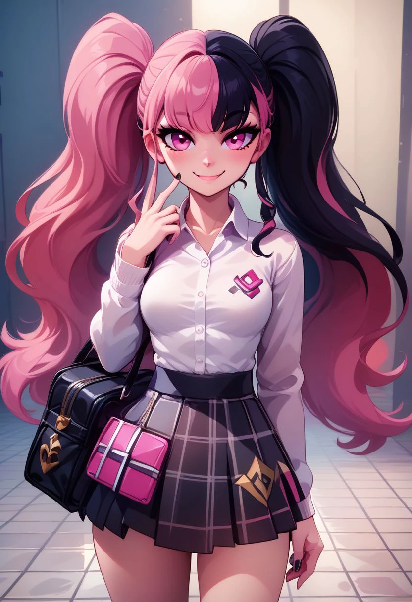 zzZoerayne, 1girl, solo, pink eyes, multicolored hair, two-tone hair, split-color hair, twintails, long hair,