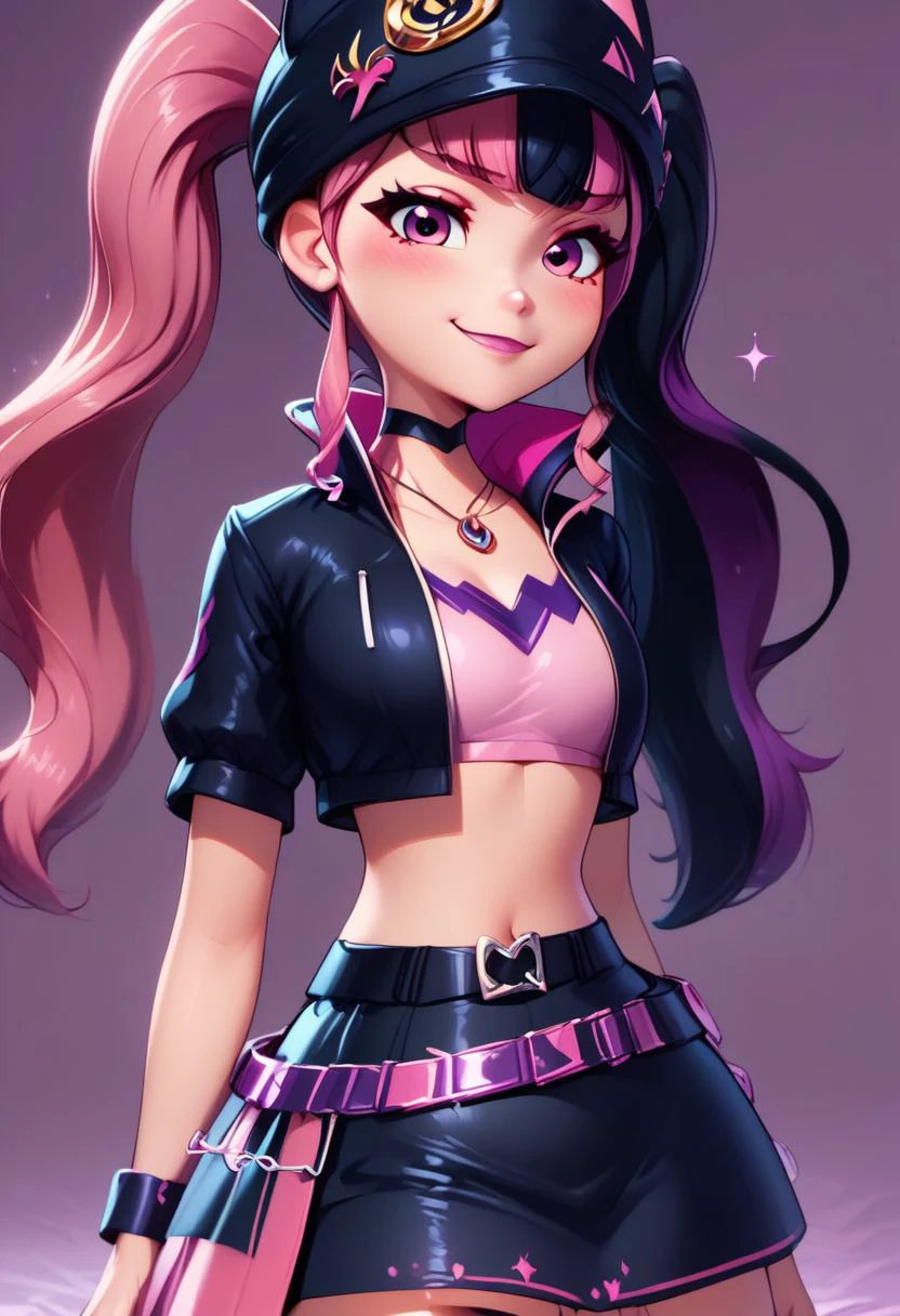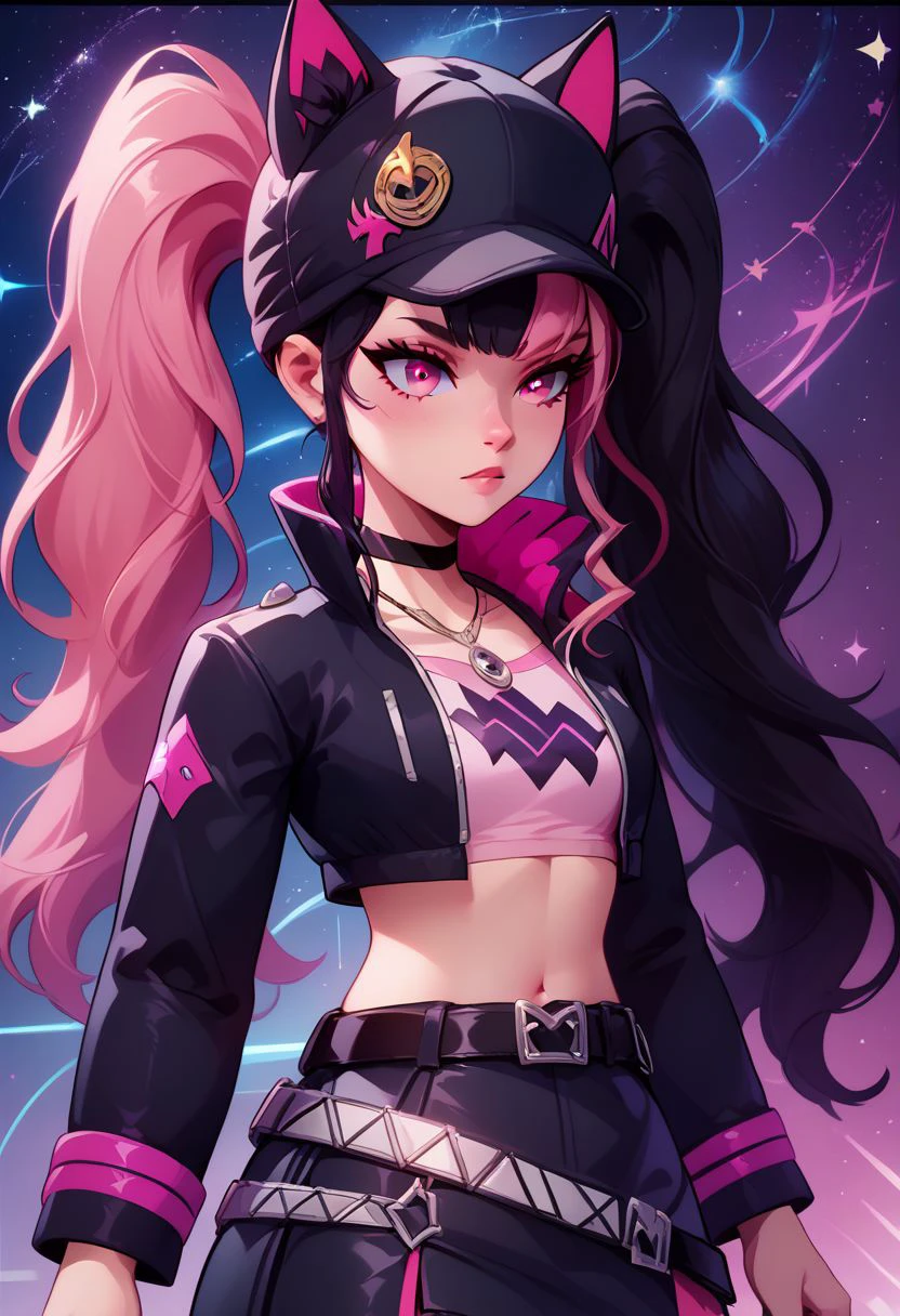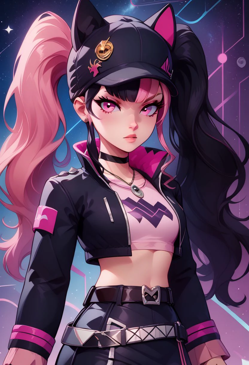 zzZoerayne, 1girl, solo, pink eyes, multicolored hair, two-tone hair, split-color hair, twintails, long hair, black hat, animal ear headwear, black choker, black jacket, cropped jacket, choker, belt, miniskirt, black skirt, necklace, pendant, midriff, crop top