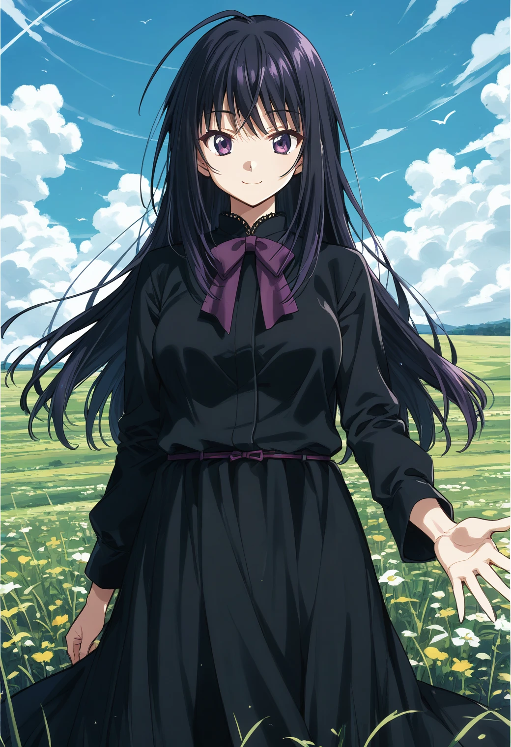 ever17_tugumi, purple eyes, black hair, long hair, ahoge, bowtie, black dress, long skirt, long sleeves, lace,