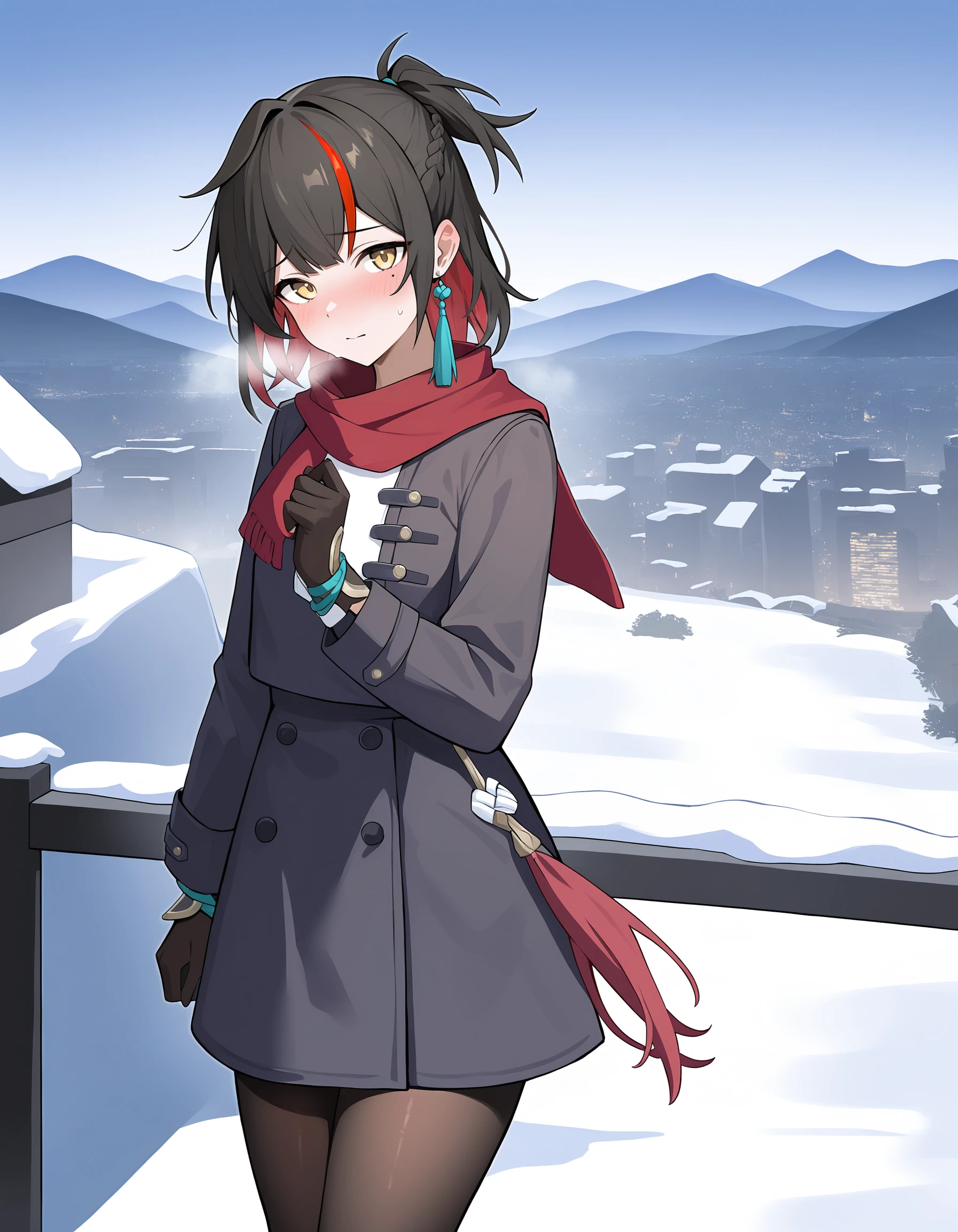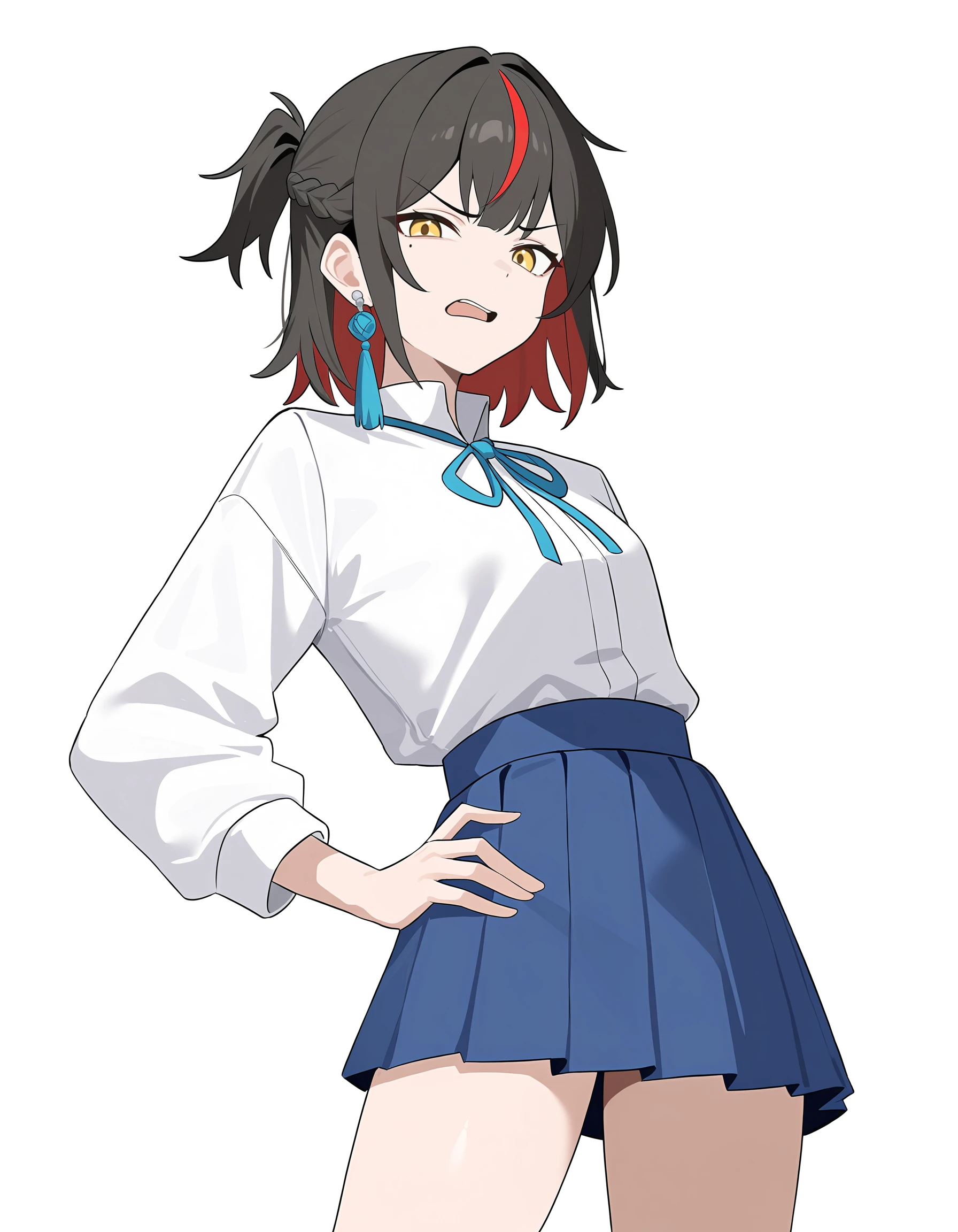 guimo,1girl,solo,black hair,mole under eye,multicolored hair,jewelry,red hair,yellow eyes,streaked hair,earrings,tassel earrings,short hair,short ponytail,braid,