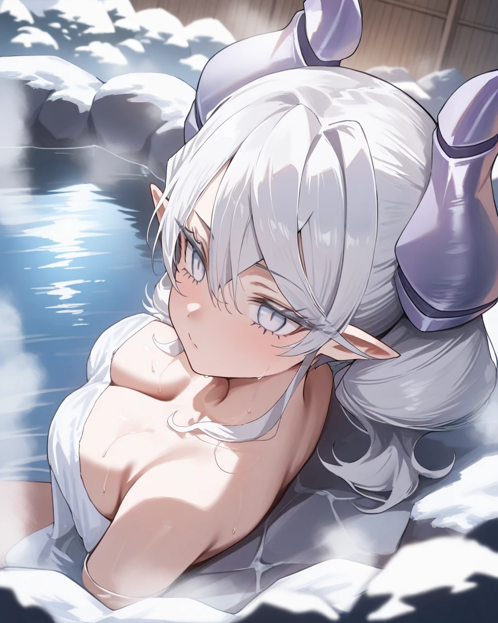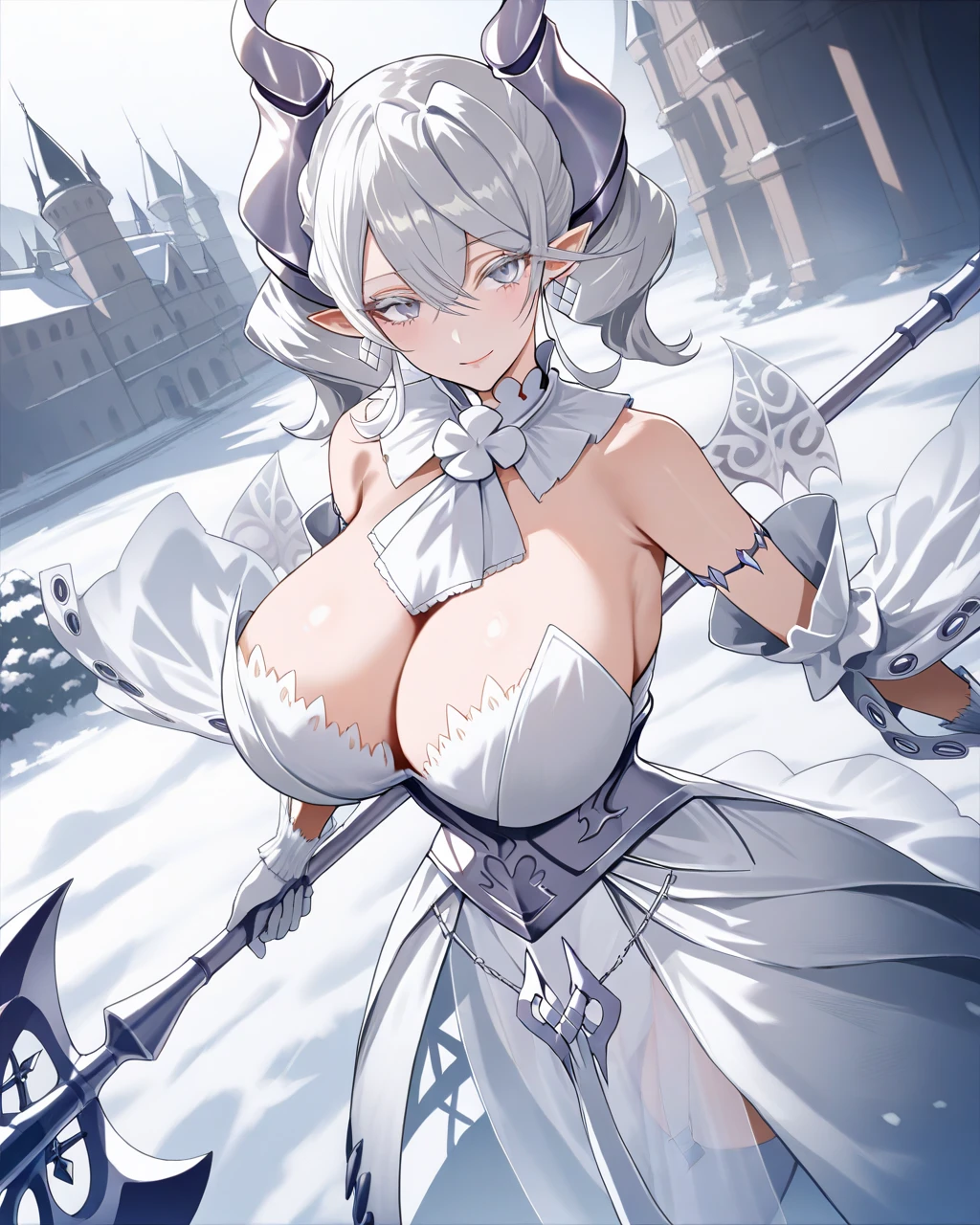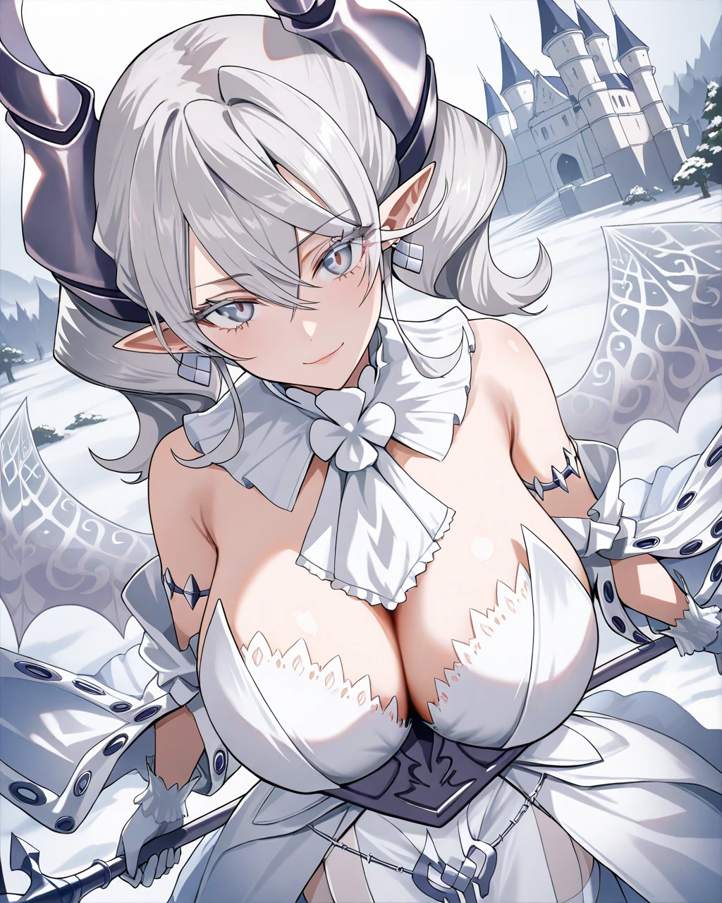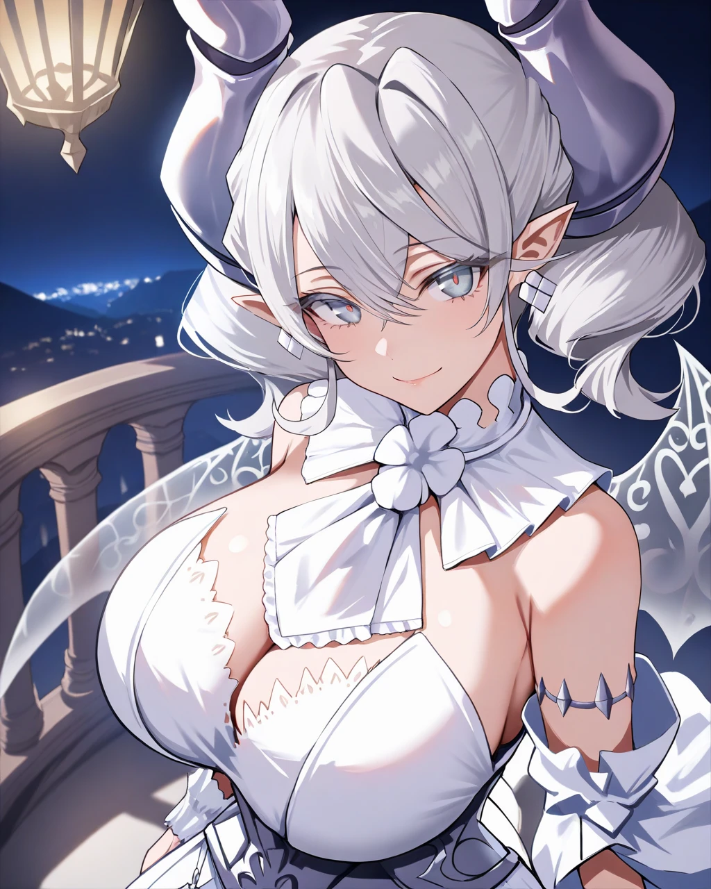 horns, white hair, twintails, grey eyes, eyelashes, earrings, ascot, white dress, detached sleeves, white gloves, wings, transparent wings, white thighhighs, high heels