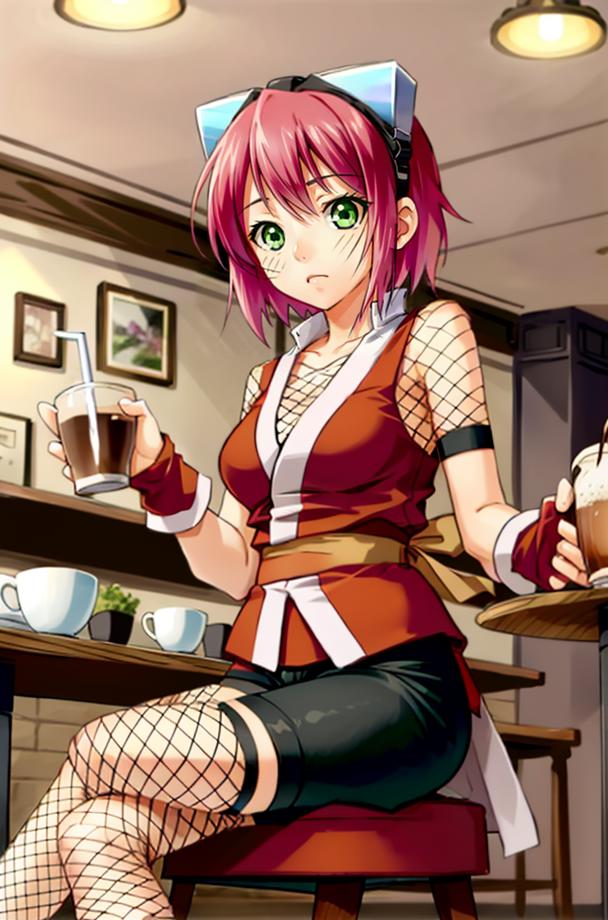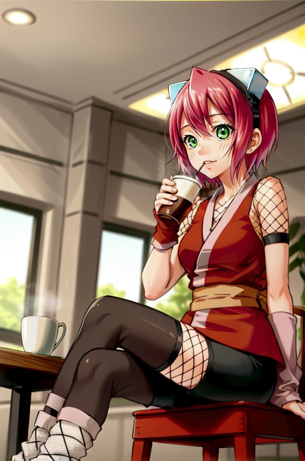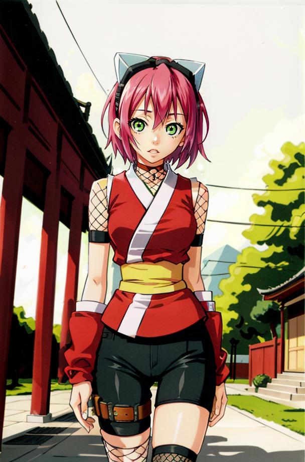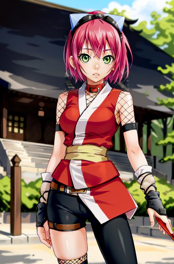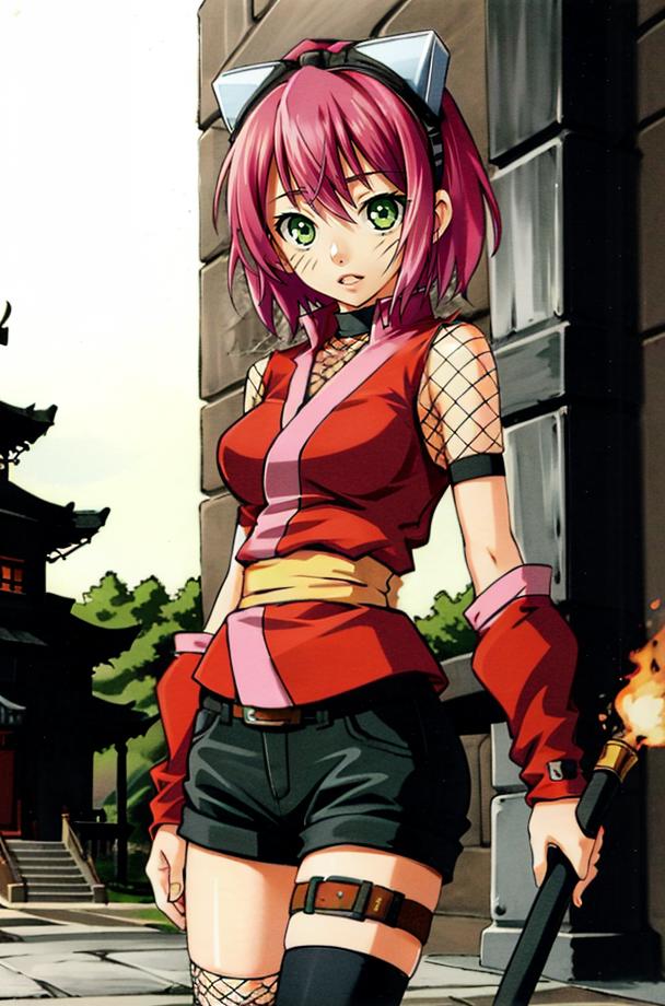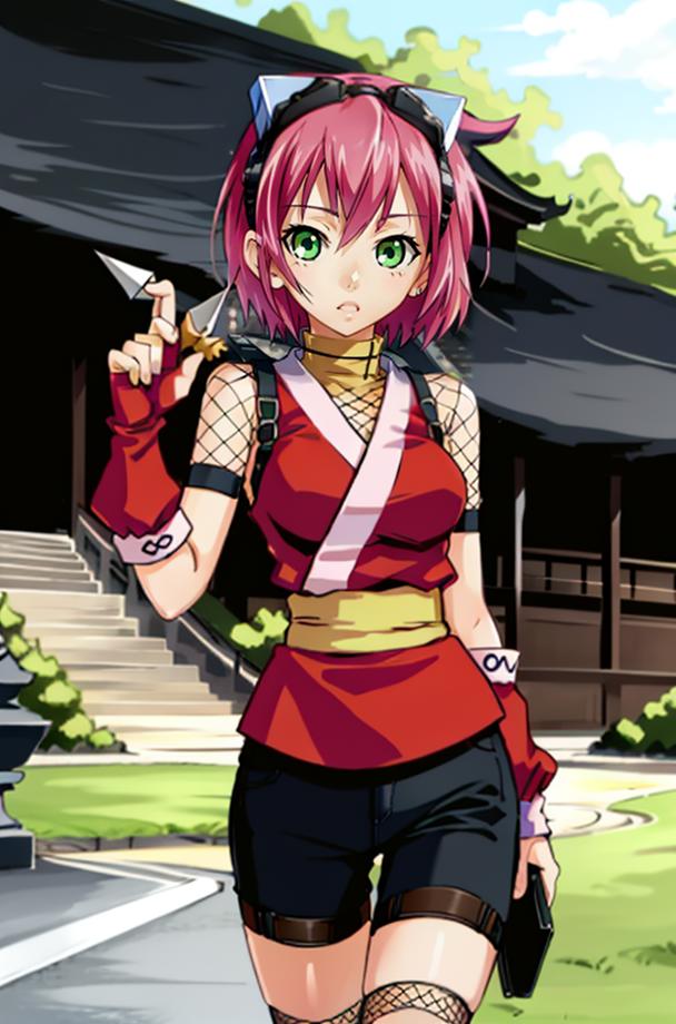 (red ninja clothes, ninja, fishnet, fishnet legwear, black spandex shorts, shuriken),