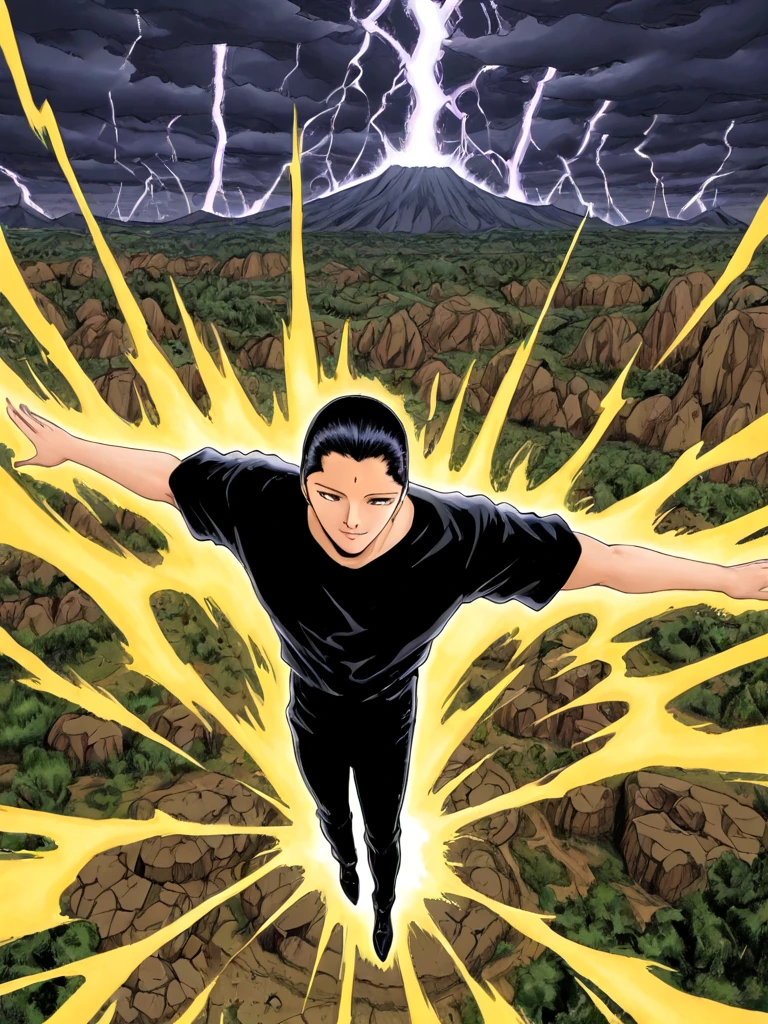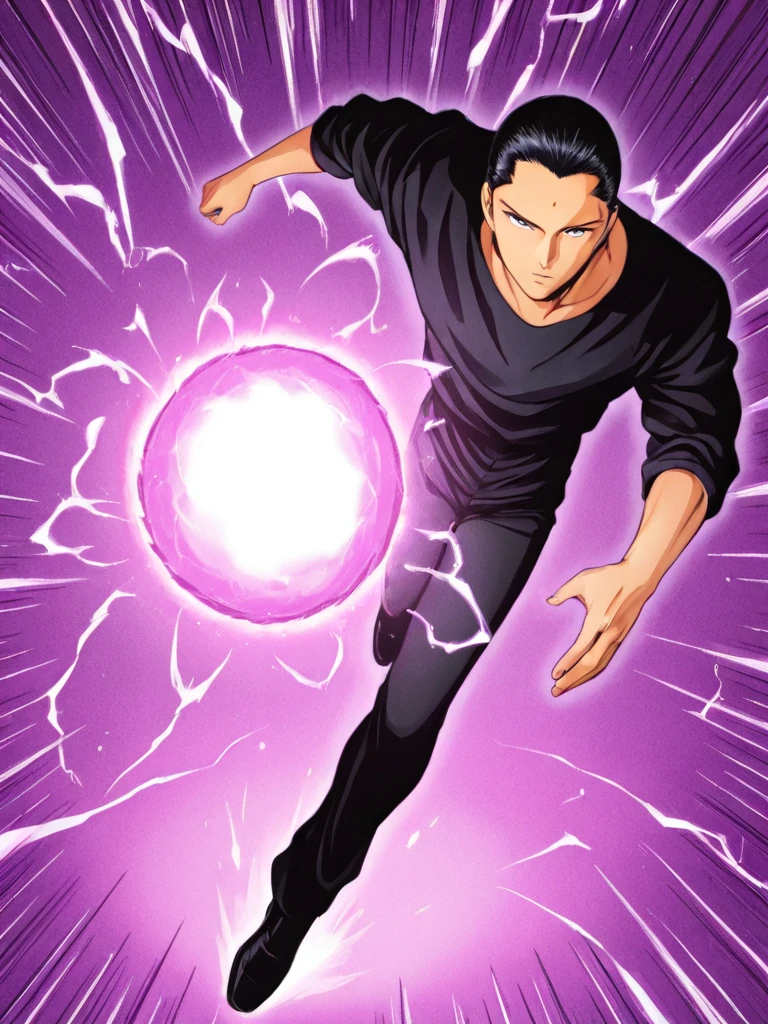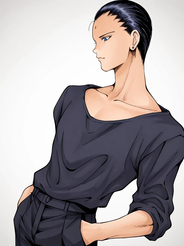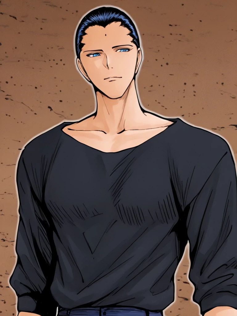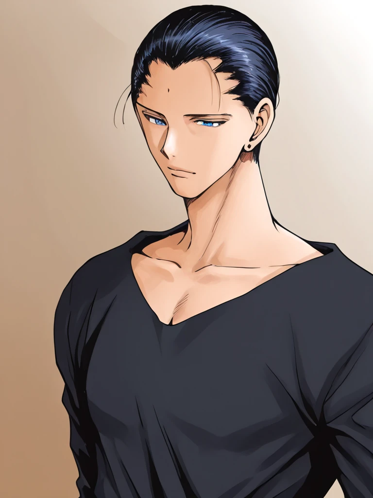 sensui shinobu, 1boy, solo, collarbone, blue eyes, toned male, tall male, male focus, black shirt, stud earrings, hair slicked back,