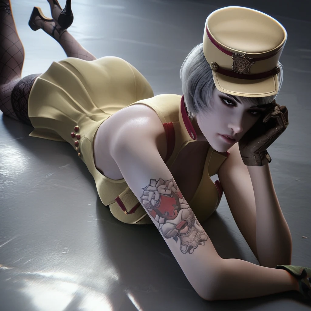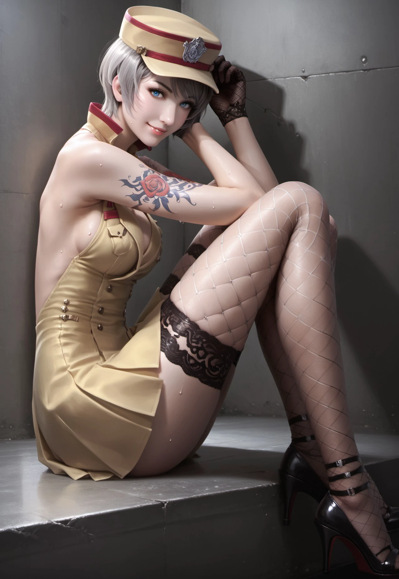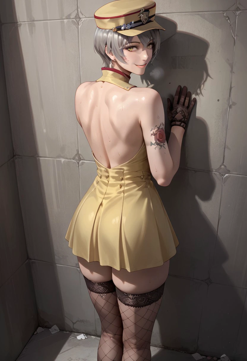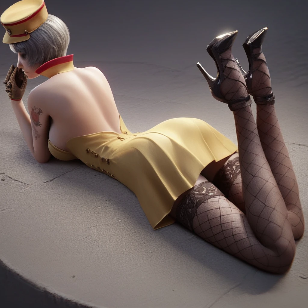 cf_fox, large breasts, bra, gray hair, short hair, hat, yellow dress, uniform, gloves, arm tattoo, black thighhighs, fishnet, high heels,