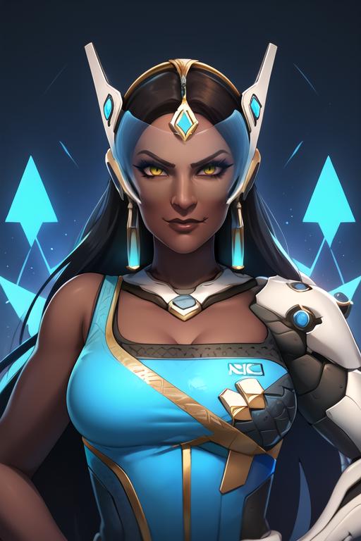 Triggers - symmetra, blue dress, one mechanical arm, visor, thighhighs