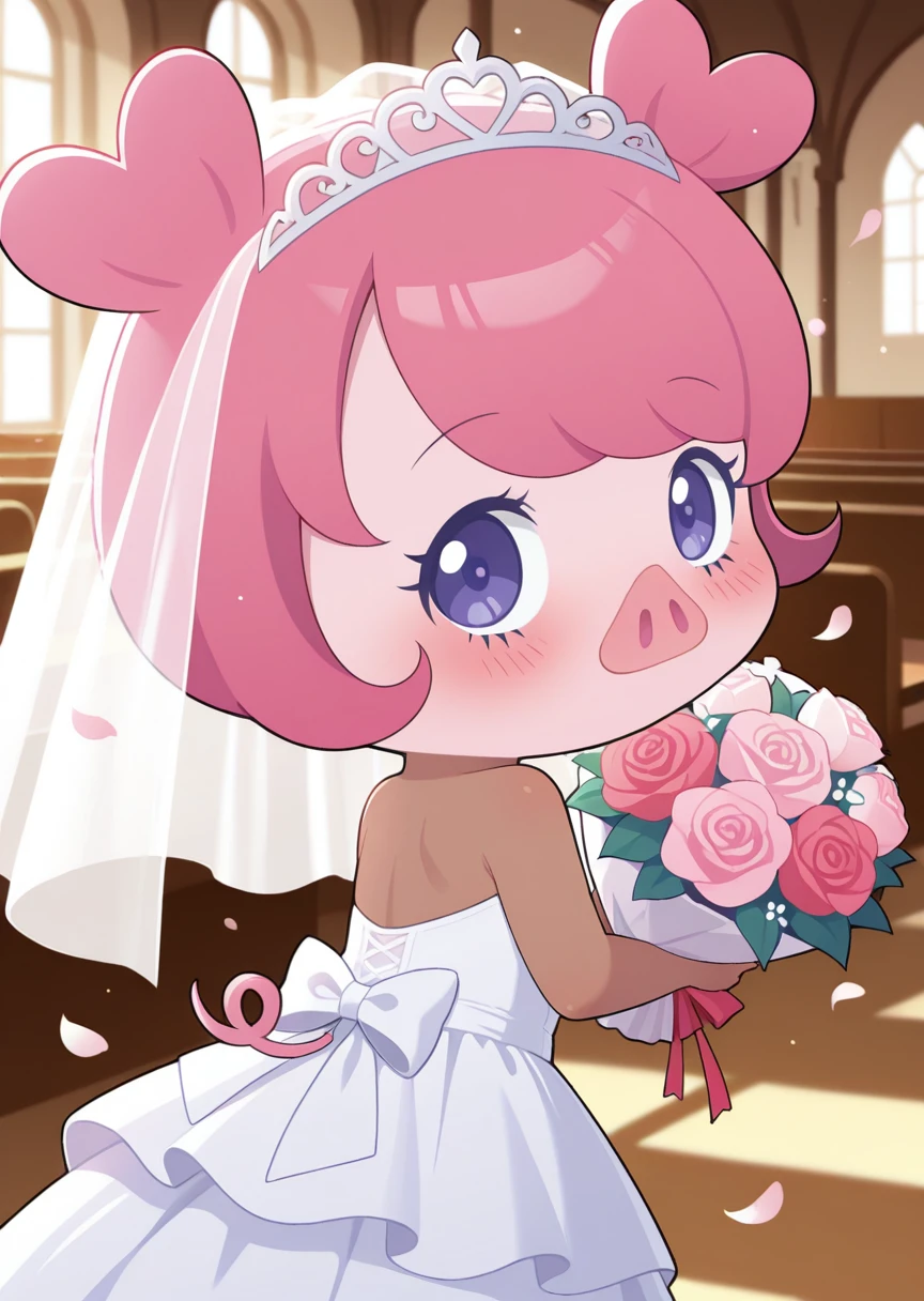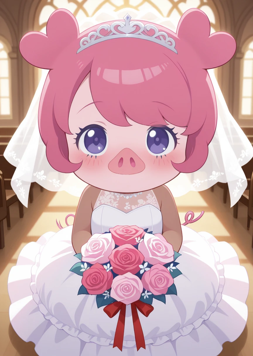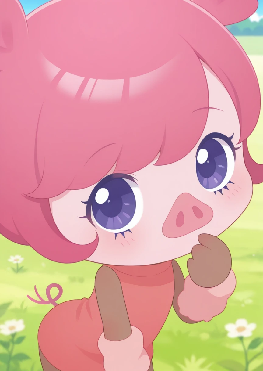 prompt: pig macar0n, furry, animal ears, pink hair, purple eyes, pig nose, arm warmers, pig tail, pink face, dark skin, pink strapless high neck dress, no mouth,