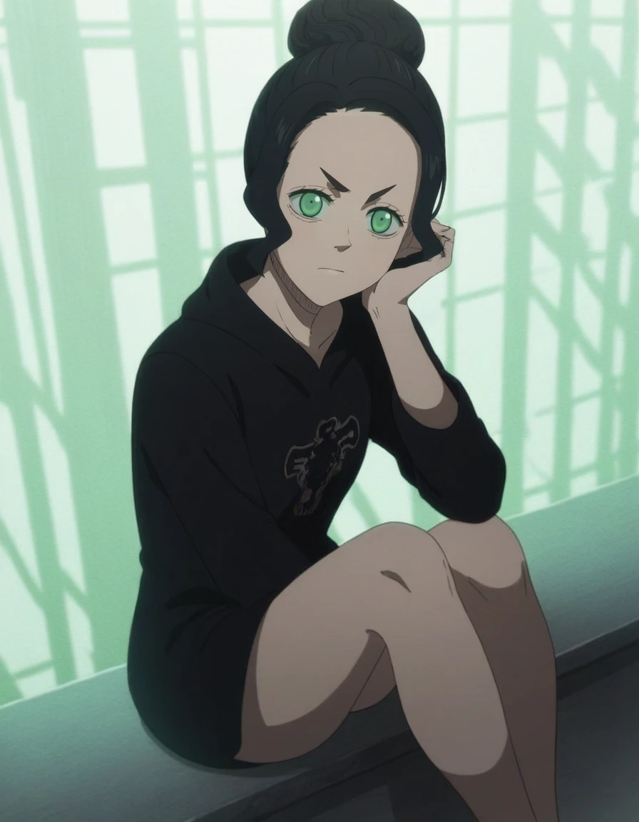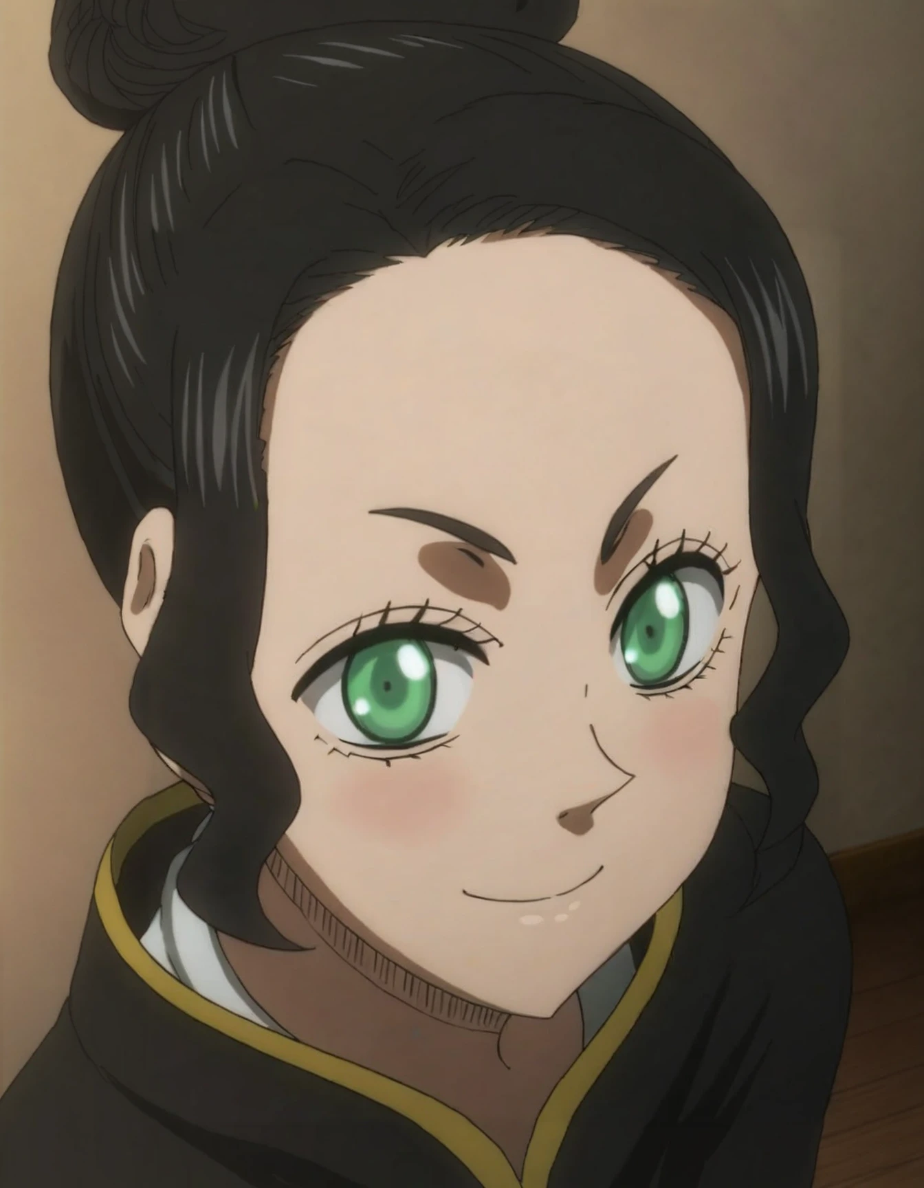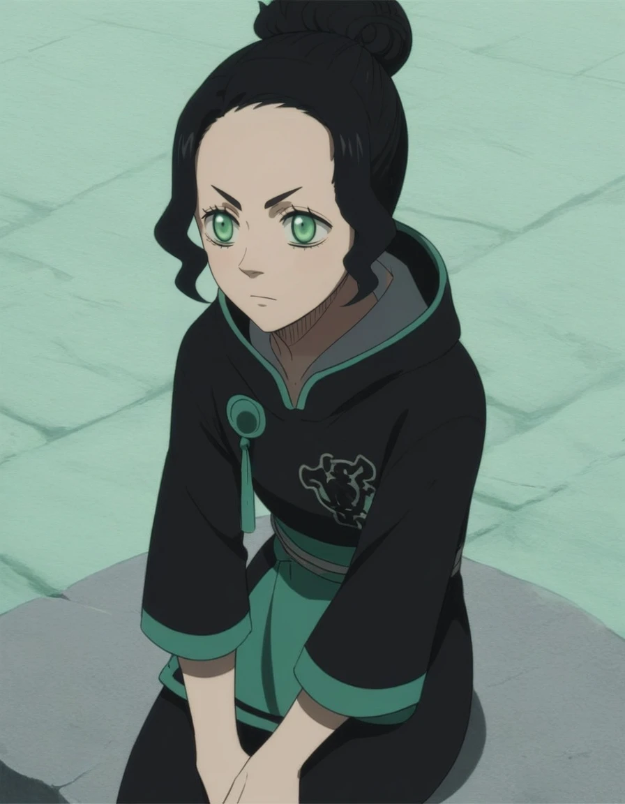 charmy, black hair, green eyes, single hair bun