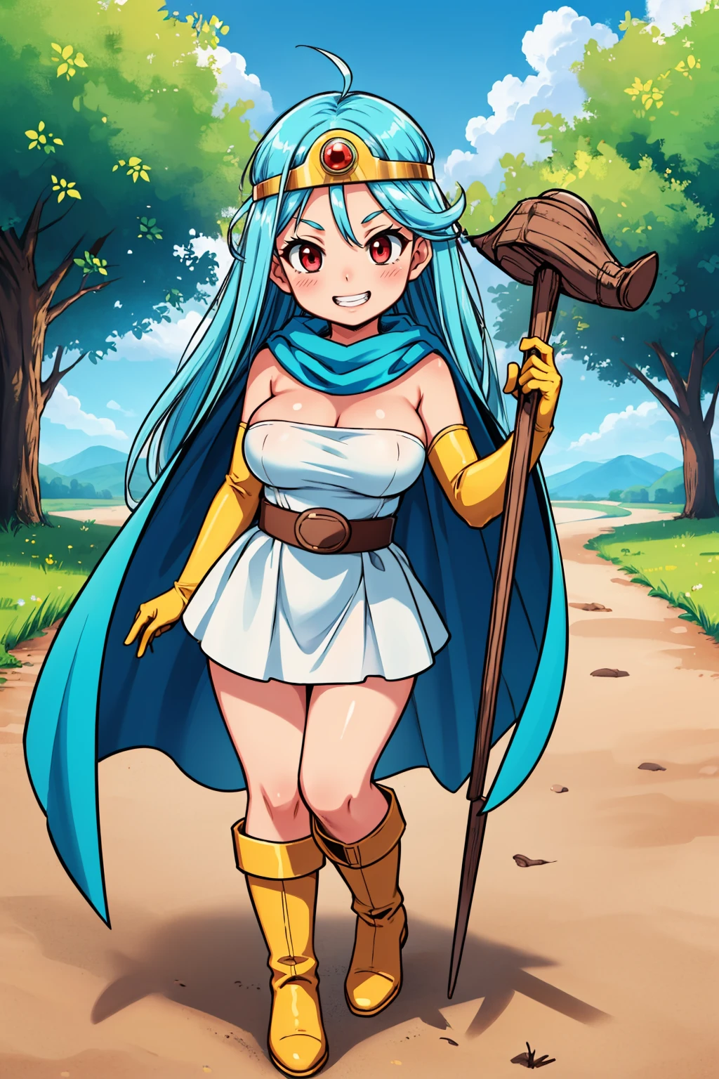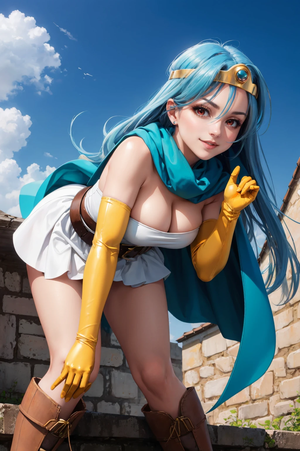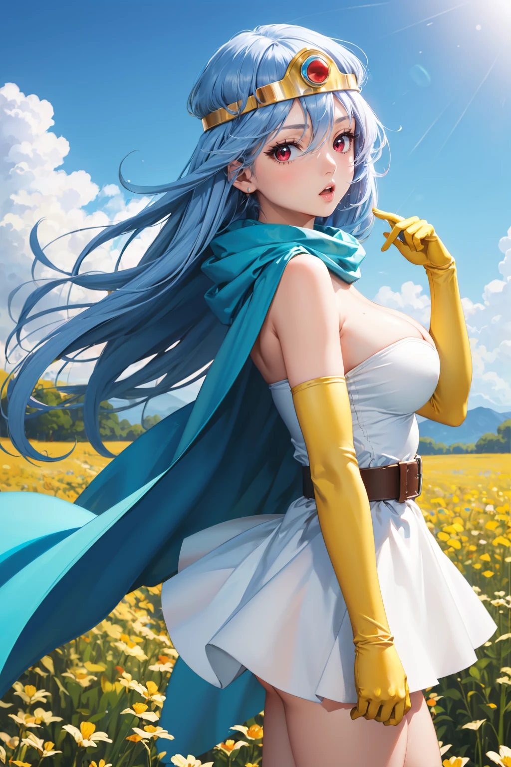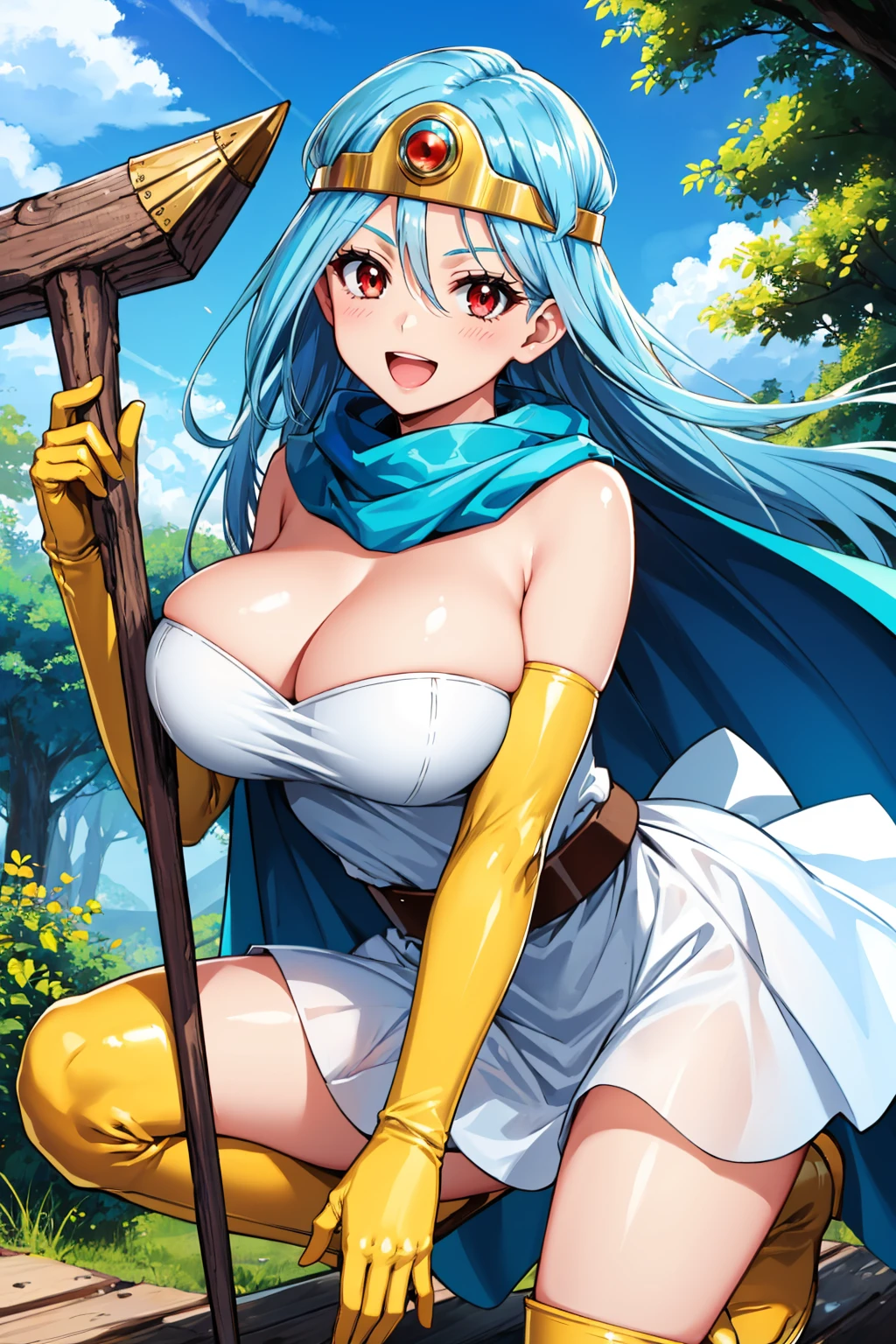 circlet, blue cape, cleavage, white dress, strapless, belt, elbow gloves, yellow gloves, yellow boots