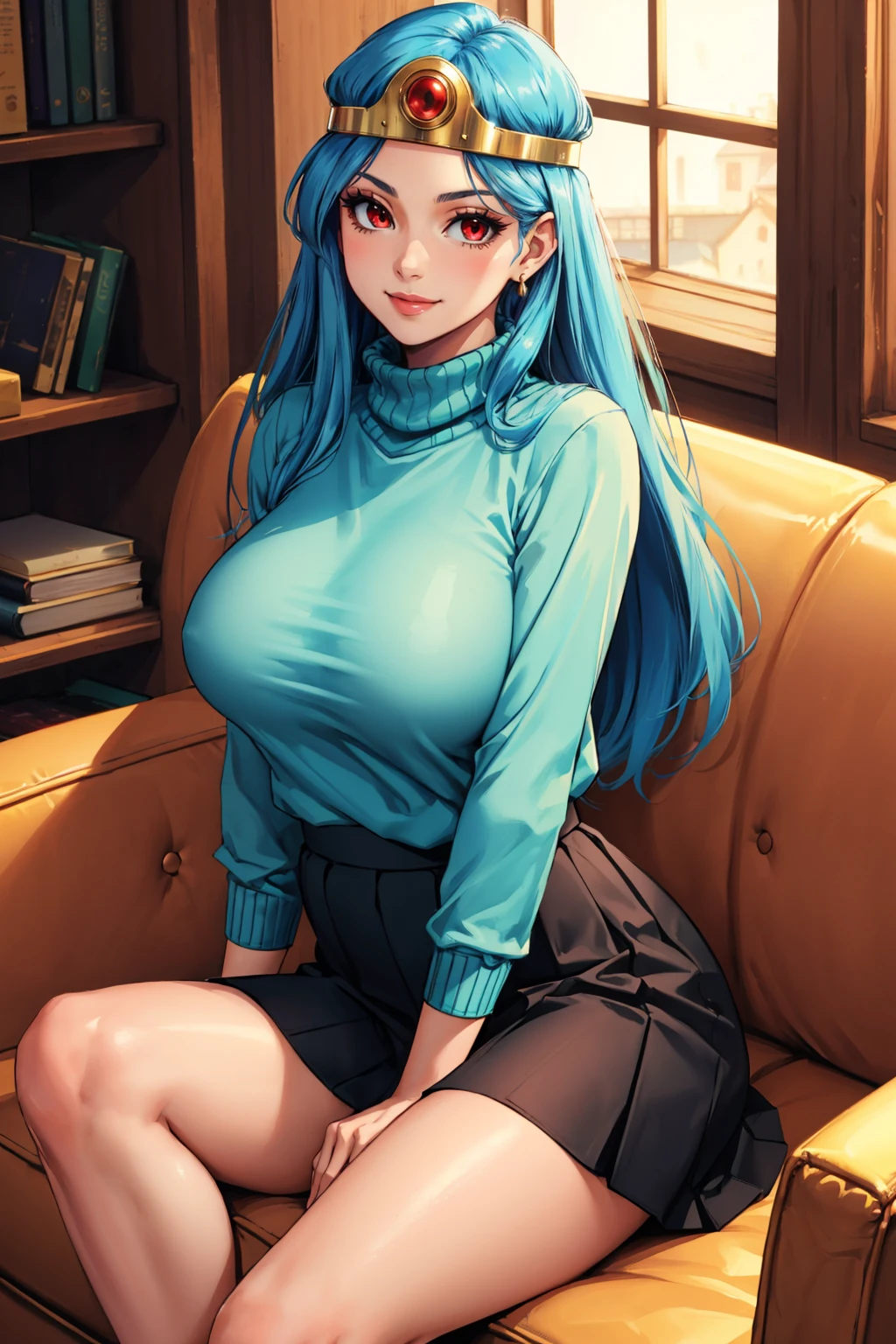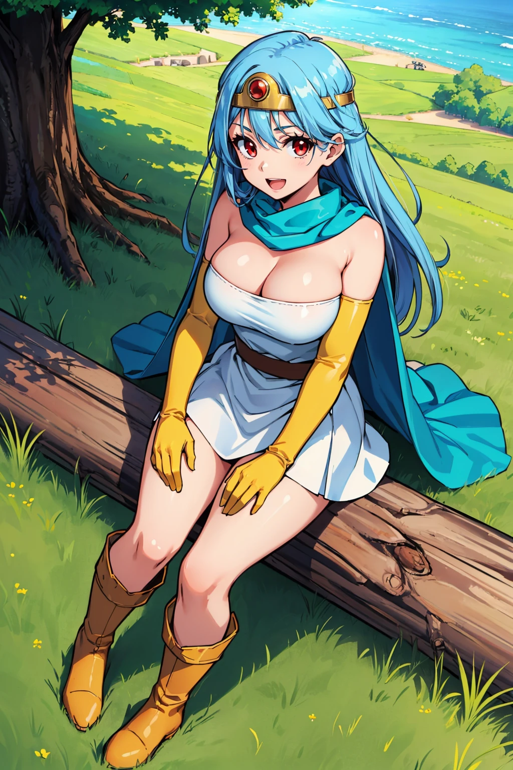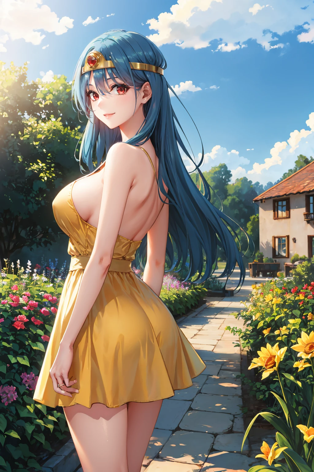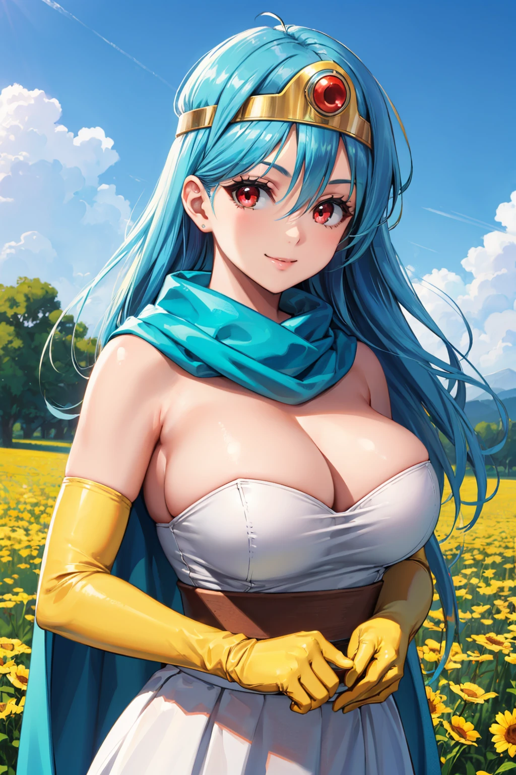 Add "circlet, blue cape, cleavage, white dress, strapless, belt, elbow gloves, yellow gloves, yellow boots" for her typical look.