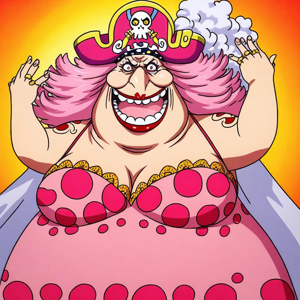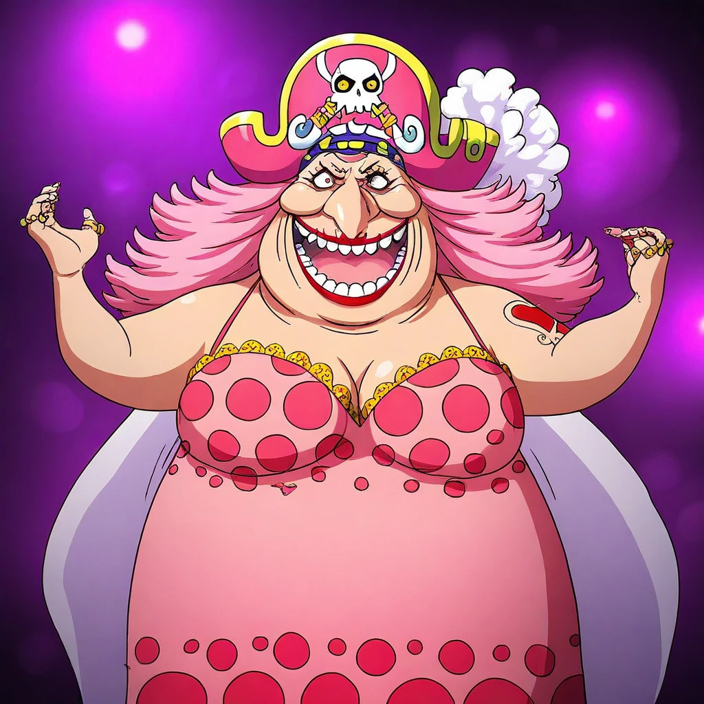 CharlotteLinlinOP, 1girl, solo, chubby, fat woman, long hair, pink hair, pink pirate hat, brown eyes, red lipstick, makeup, teeth, huge breast, cleavage, pink polka dot dress, belly, jewelry, thick thighs, tattoo, pink shoes,