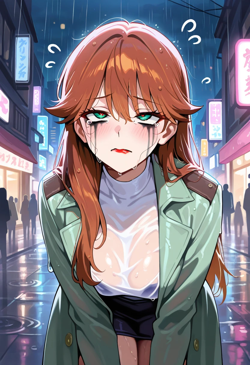 smearedmakeup, 1girl, solo, shoulder_length_hair, auburn_hair, green_eyes, mascara, eyeliner, red_lipstick, tears, crying, standing_in_rain, wet_hair_plastered_to_face, soaked_beige_trenchcoat, city_street, night, neon_signs_reflecting_in_puddles, looking_up_at_sky, rain_drops_on_skin, melancholic, atmospheric, masterpiece, best quality, absurdresNSFW — Ahegao Missionary: