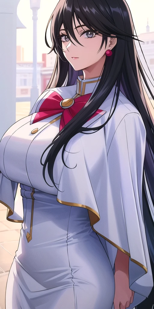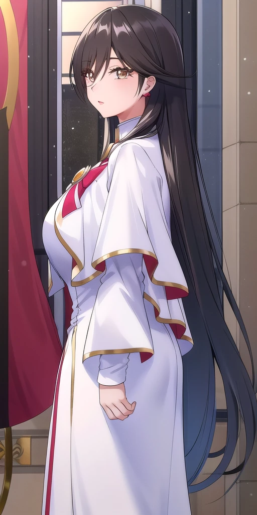 Winter_Himeya_company_uniform_White_long_dress_White_capelet_Red_bowtie_Long_sleeves_high_collar_Side_slit: Winter Himeya uniform.