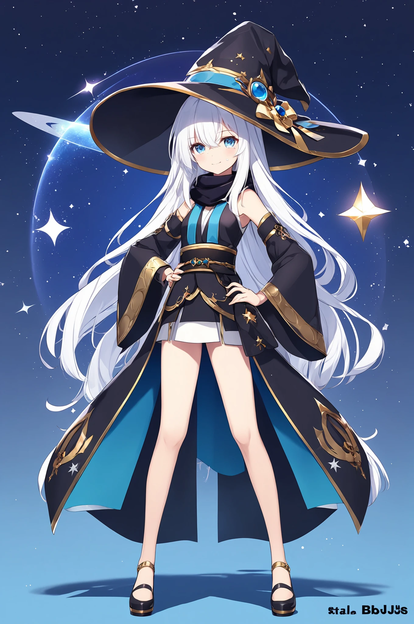 masterpiece,best quality,4k,1girl, ^^^, animal ears, bangs, bare legs, bare shoulders, black gold headwear, black scarf, blue eyes, closed mouth, color guide, detached sleeves, full body, hair between eyes, hand on hip, hand up, hat, stella , long hair, looking at viewer, obi, white hair, reference sheet, sash, scarf, simple background galaxy , smile, standing, very long hair, galaxy background, wide sleeves, witch hat, yae sakura, (masterpiece:1,2), best quality, masterpiece, highres, original, extremely detailed wallpaper, perfect lighting,(extremely detailed CG:1.2),1girl, upper body, shine, light line glass, dispersion, eyes, tears