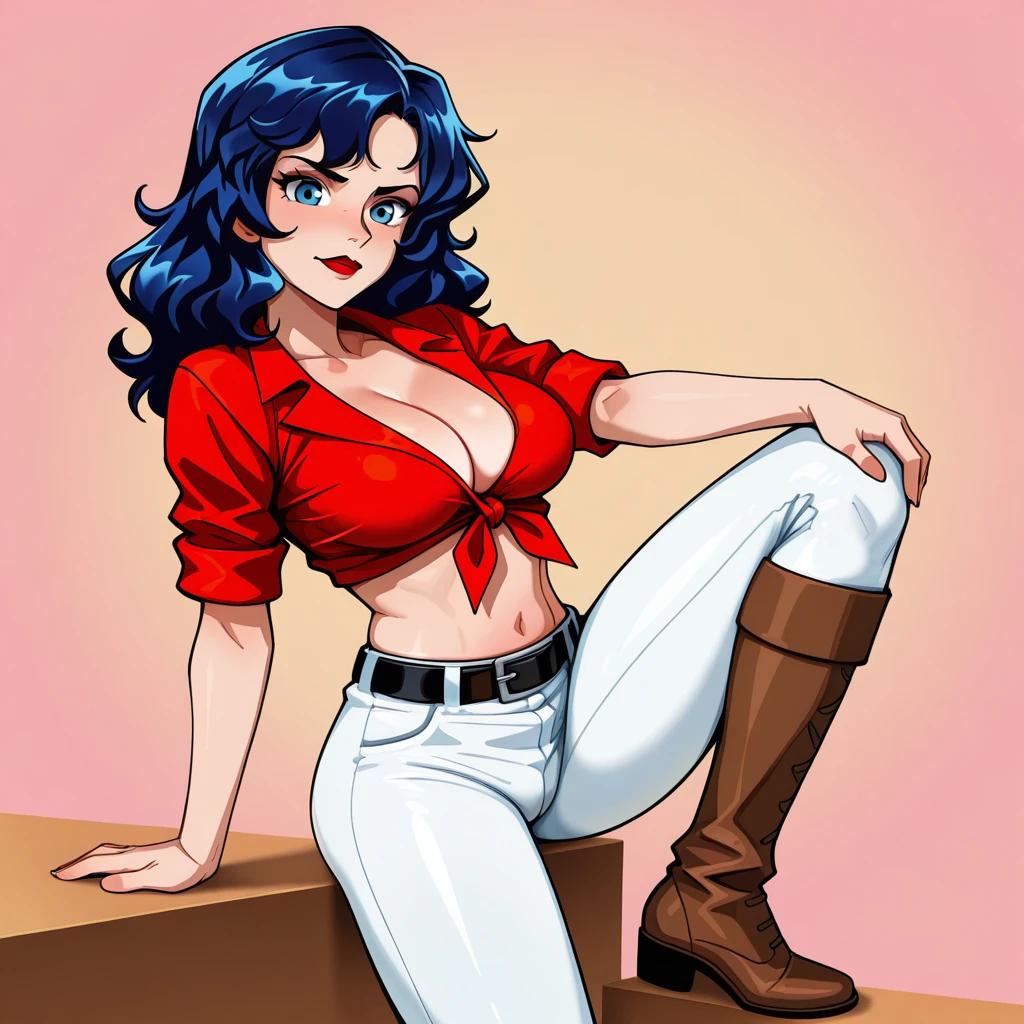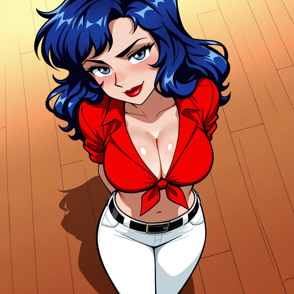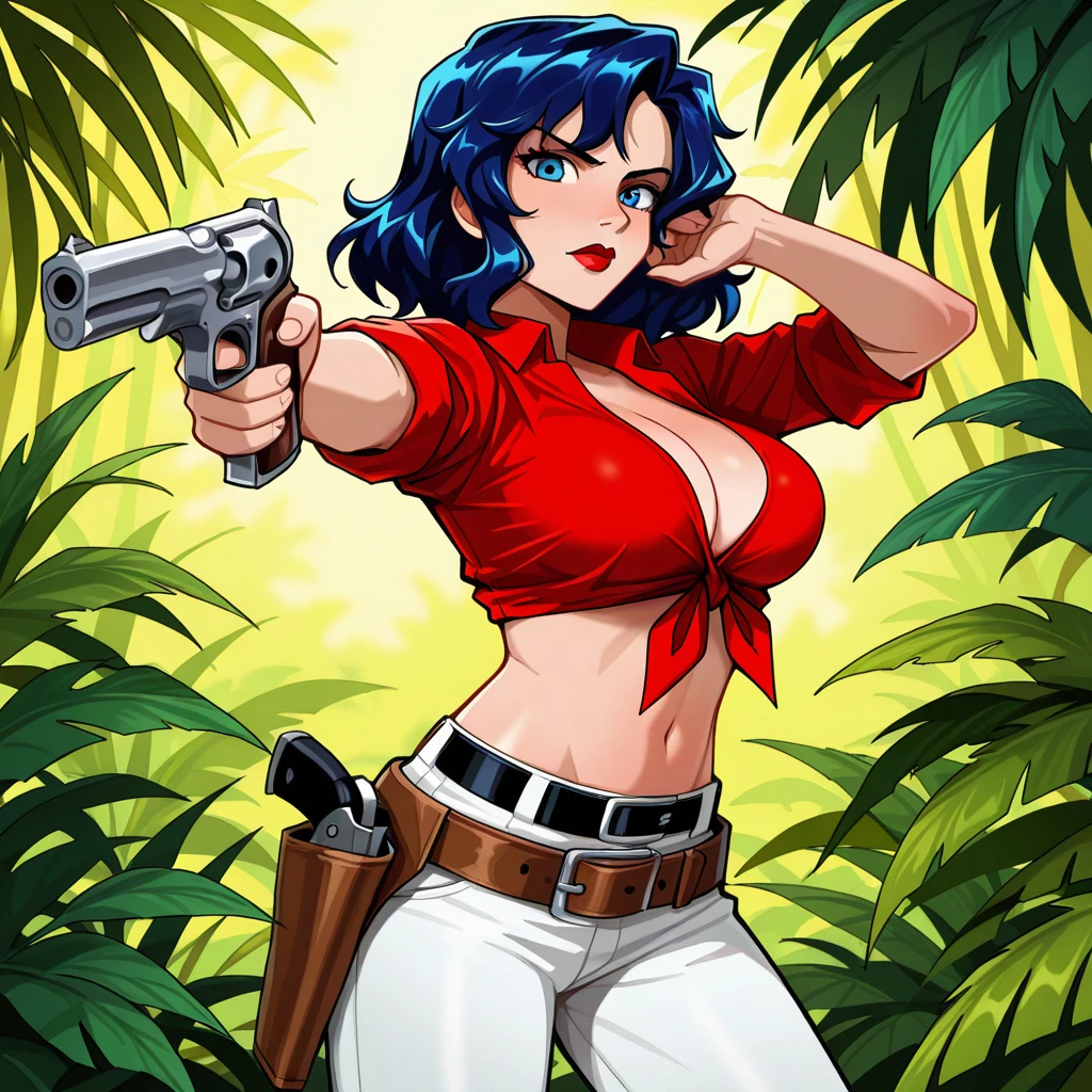 HannahDundee, 1girl, solo, large breasts, red lips, blue eyes, blue hair, long hair, red shirt, tied shirt, midriff, sleeves rolled up, pants, white pants, belt